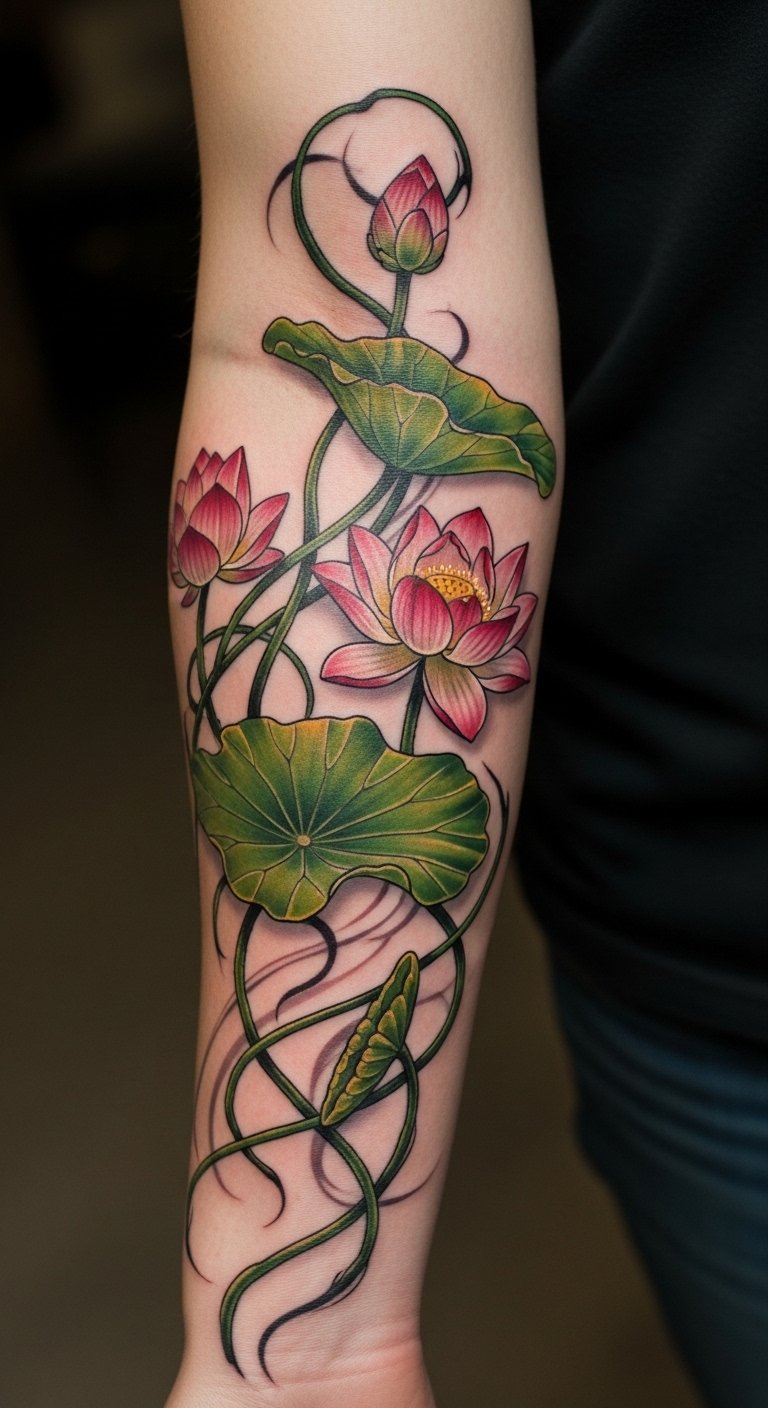 The lotus vines tattoo represents enlightenment and rebirth, embodying the purity that rises from murky waters.
