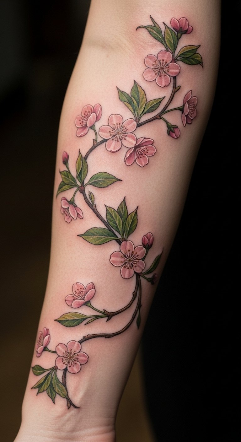 The cherry blossom vines tattoo serves as a beautiful reminder of life’s fleeting moments, elegantly embracing the symbolism of transformation and resilience.