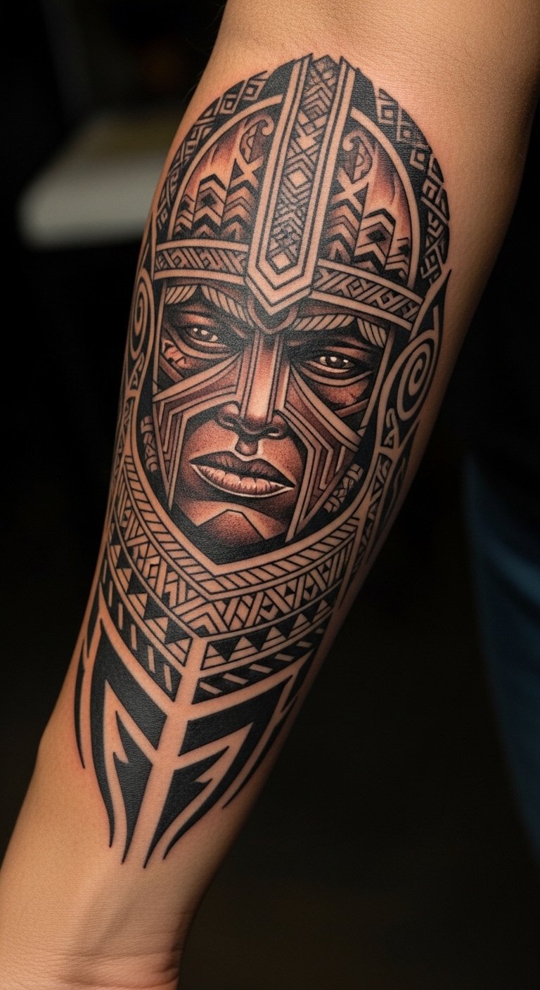 This tattoo embodies the essence of warrior resilience, with each intricate pattern reflecting deep-rooted cultural significance.