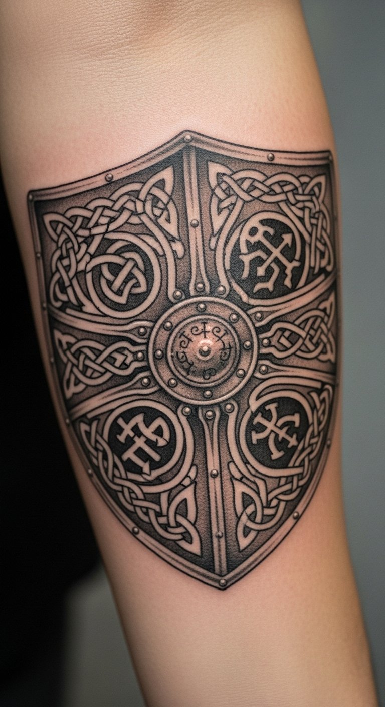 The Celtic warrior shield tattoo embodies powerful symbolism, representing protection against evil and dark forces.