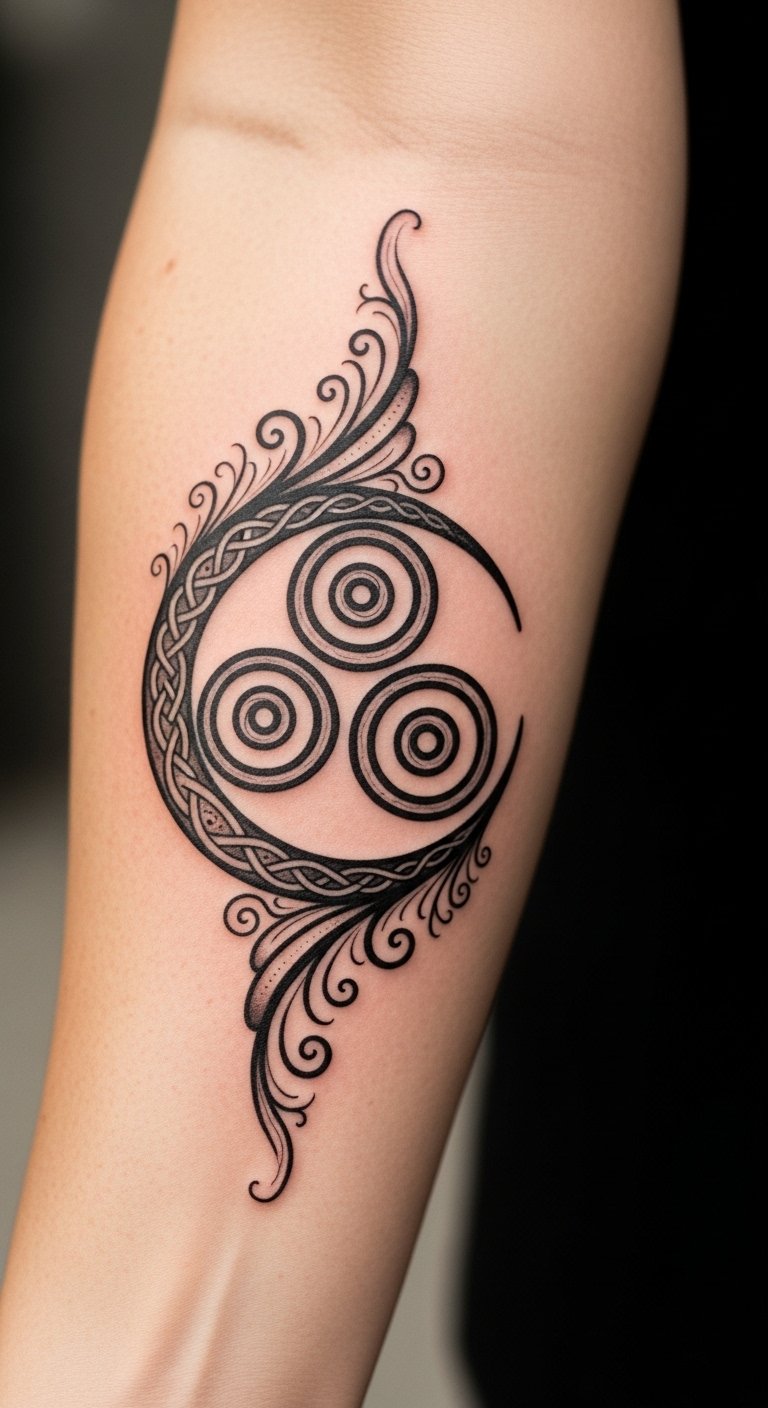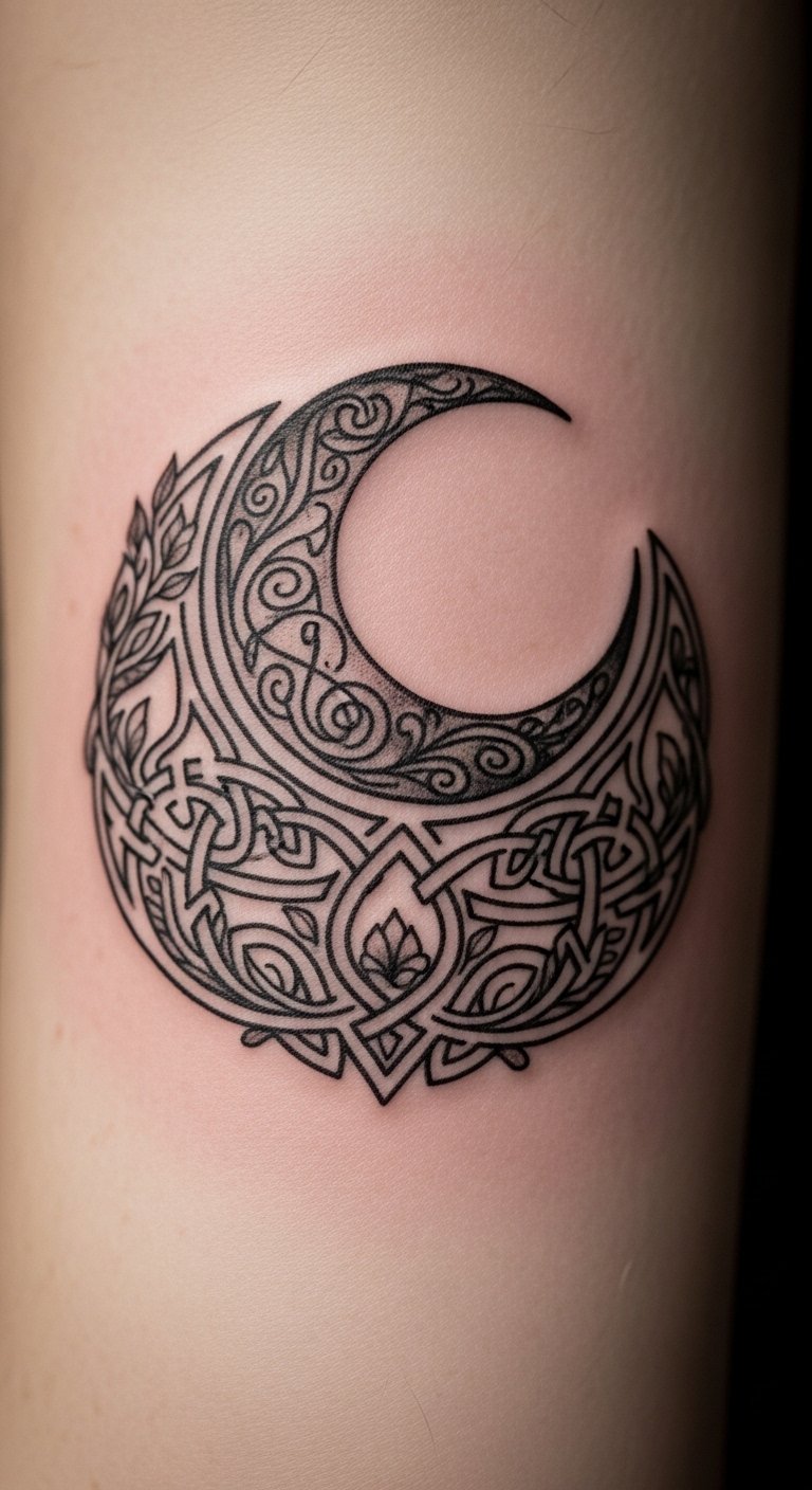 This tattoo embodies the strength and beauty of Celtic femininity through its elegant knots and lunar elements.