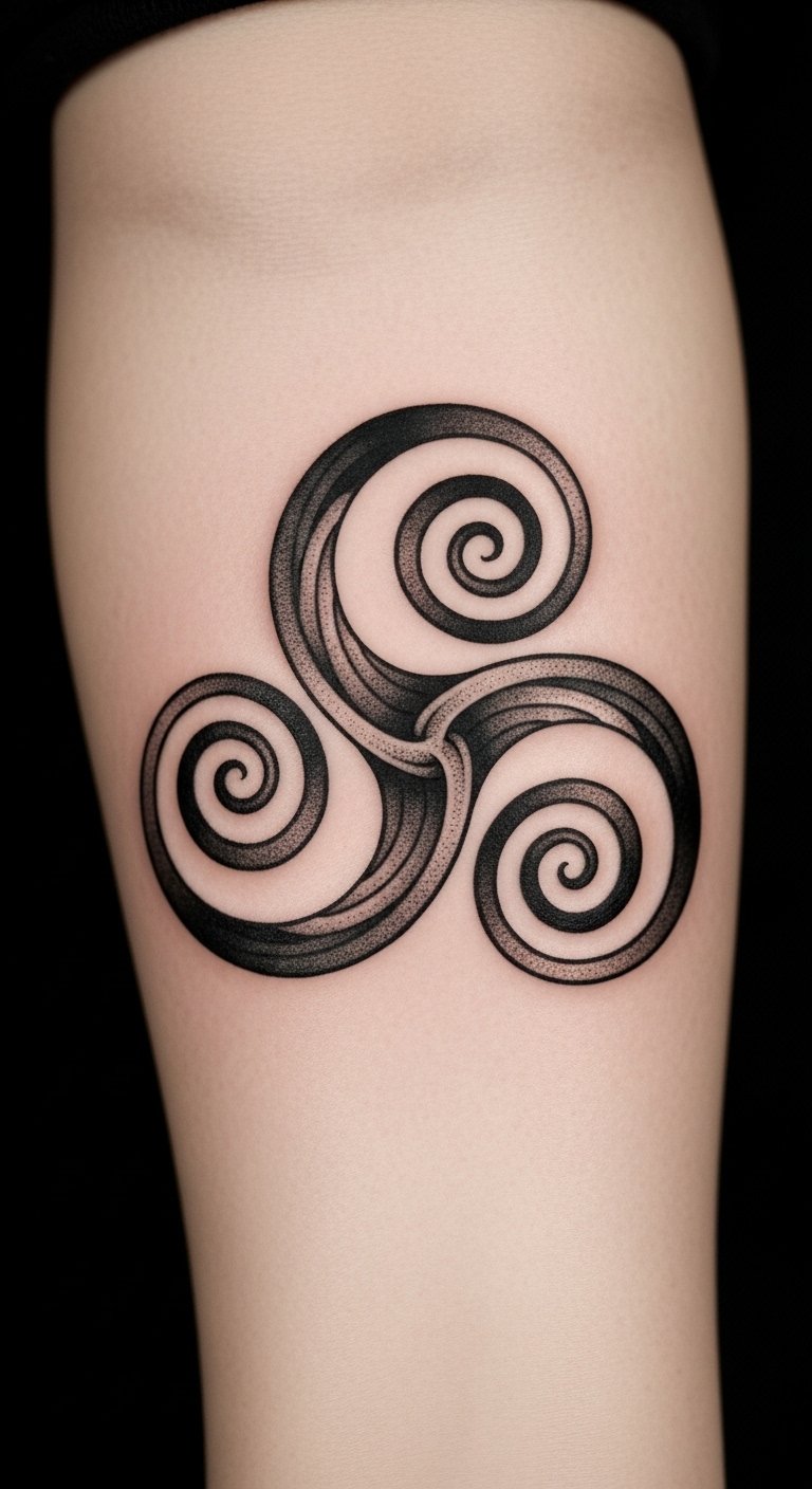 Embodying the essence of motion and rebirth, this Triskelion tattoo on the forearm serves as a constant reminder of life’s cyclical nature.