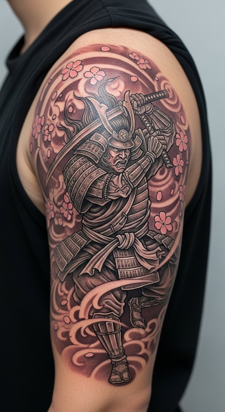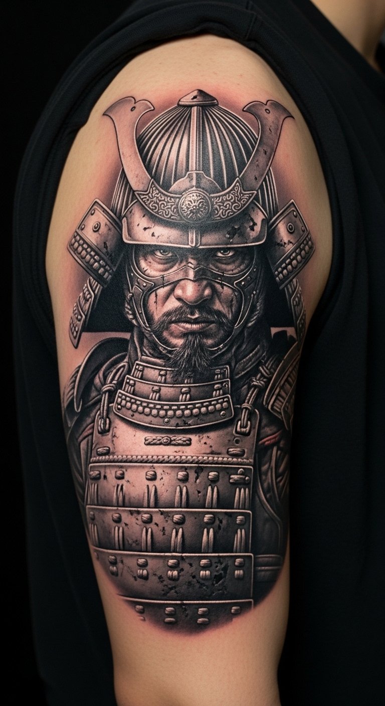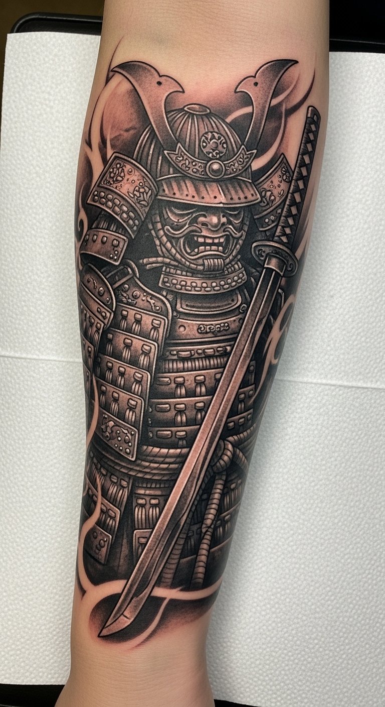 This tattoo symbolizes strength, honor, and the warrior spirit, drawing inspiration from historical samurai culture.