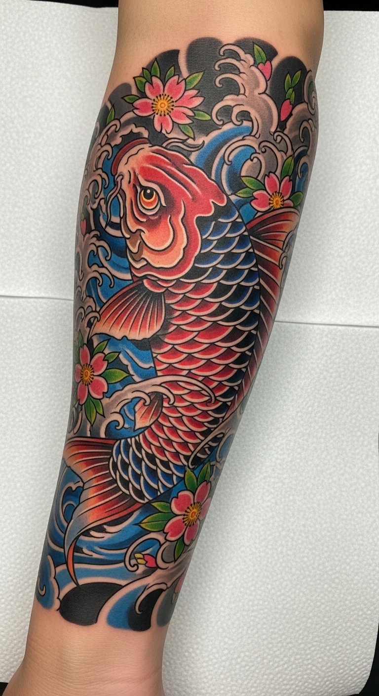 The koi fish symbolizes perseverance and determination, reflecting the warrior spirit’s journey through adversity, while the cherry blossoms represent the transient beauty of life and the honor of the samurai.