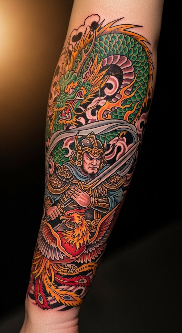 The warrior figure stands for bravery and honor, while the mythical beasts embody freedom and transformation, suggesting a personal journey through challenges.