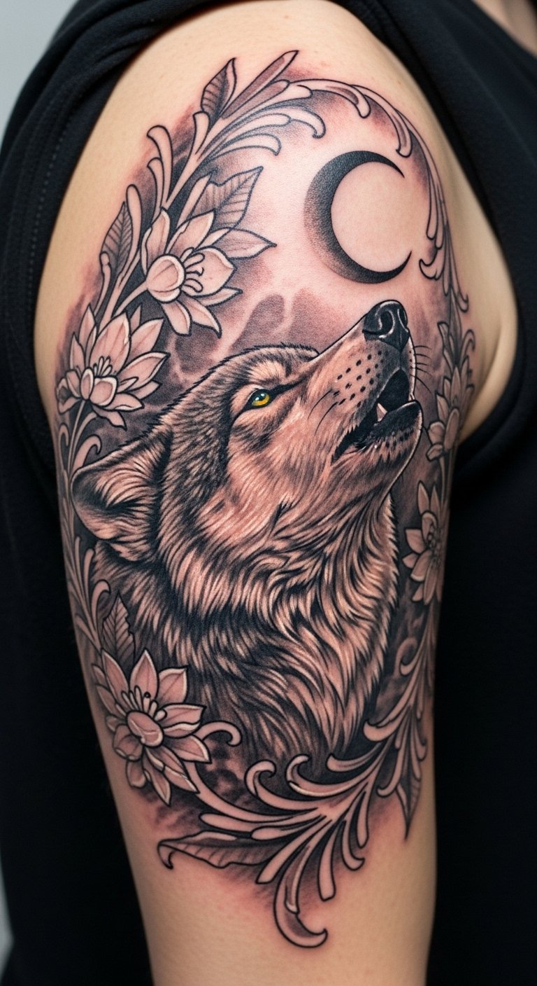 This tattoo design embodies the spirit of resilience and personal growth. The fierce wolf symbolizes courage and the instinct to overcome challenges, while the crescent moon serves as a reminder of the light that guides us through life’s darkest moments.