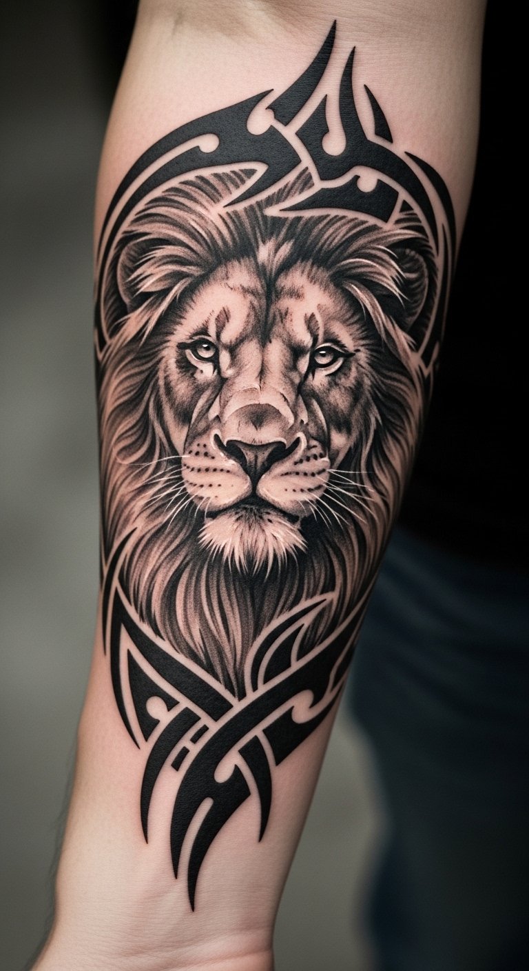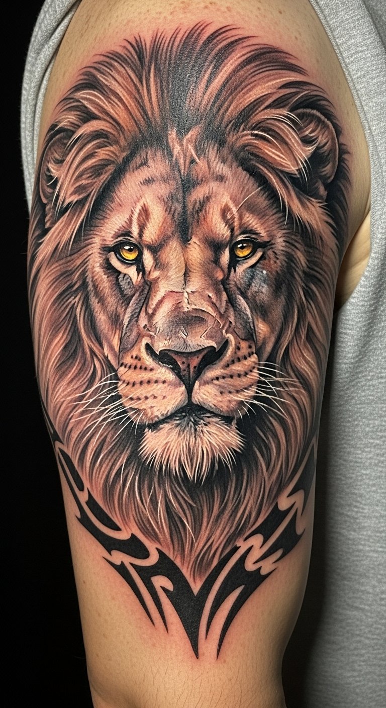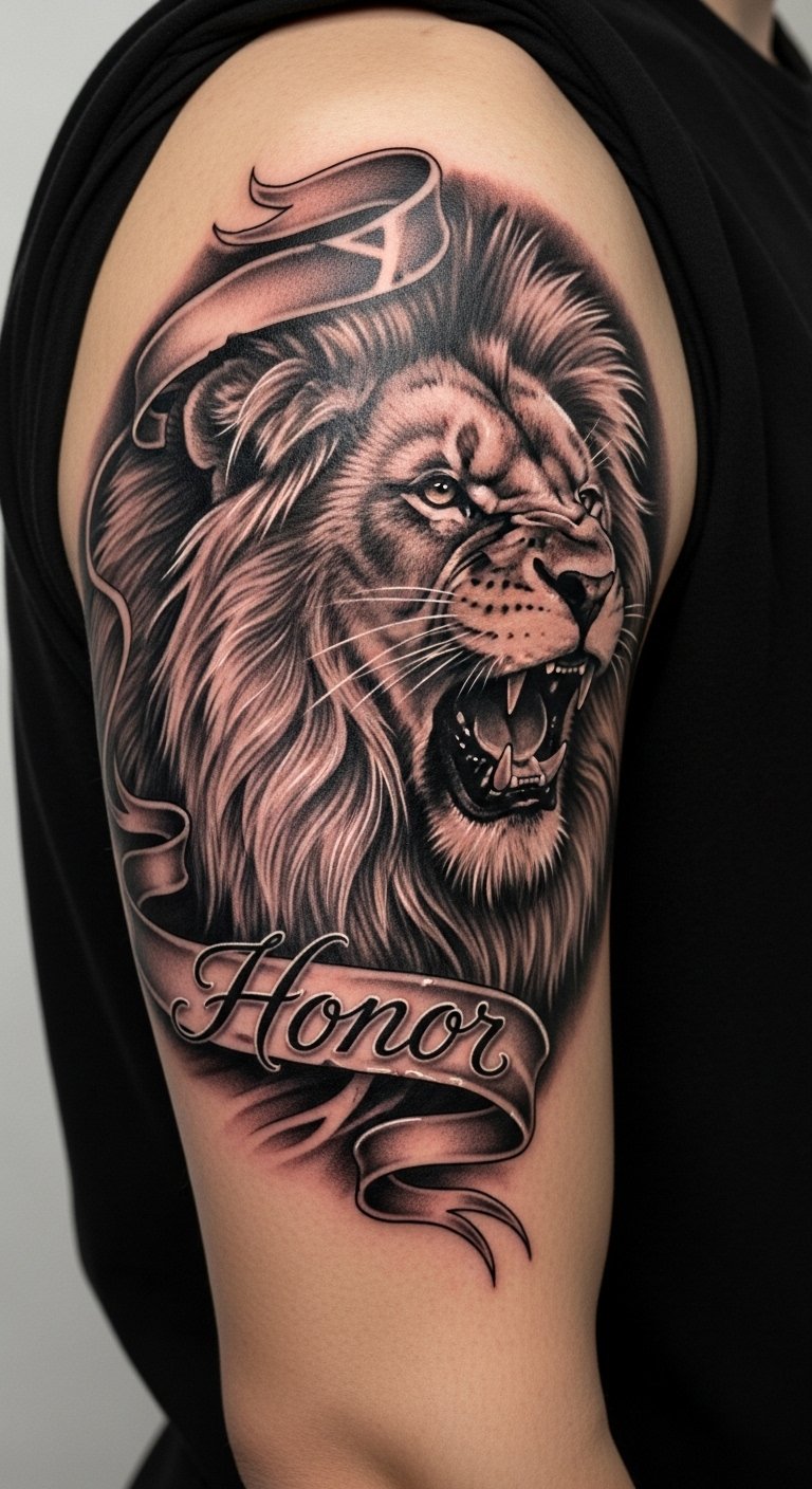 Positioned on the upper arm, this tattoo not only showcases the powerful lion but also allows for a prominent display of strength and warrior identity.