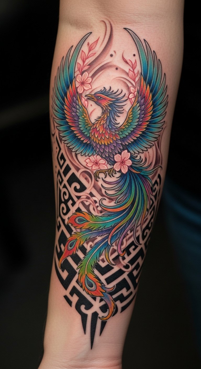 This tattoo symbolizes rebirth and resilience, drawing inspiration from the phoenix, a powerful emblem of survival and transformation.