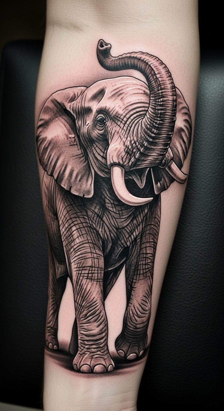 Positioned on the forearm, it remains visible to inspire courage in facing life’s challenges. The raised trunk of the elephant symbolizes triumph and the freedom to overcome obstacles, making it a powerful emblem for anyone seeking to embody these qualities in their daily life.