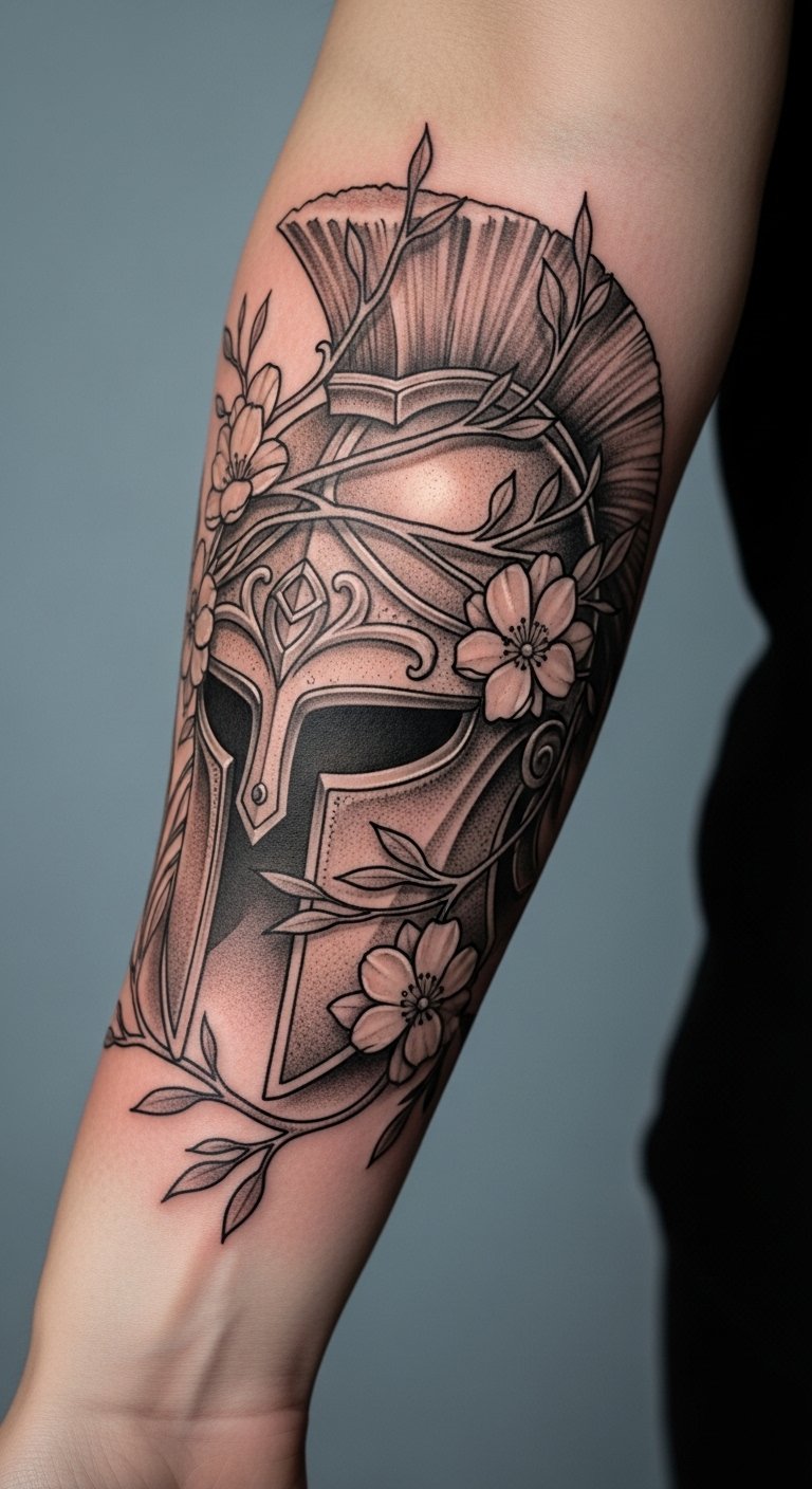 This tattoo design embodies the essence of a warrior’s journey, where the helmet symbolizes protection and valor, while the vines and flowers represent resilience and the beauty of growth through struggle.