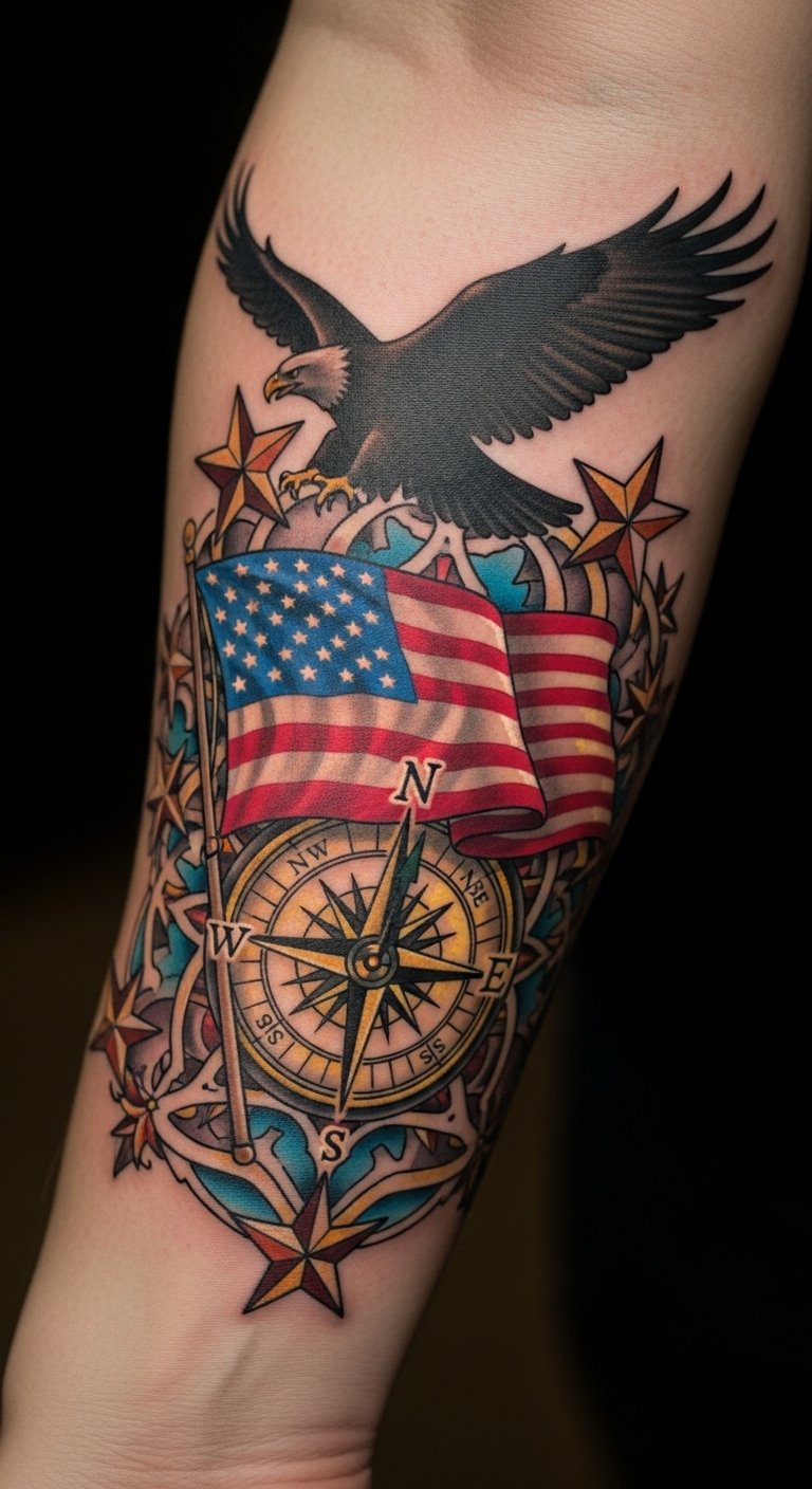 This tattoo symbolizes the journey of patriotism, with the flag representing love for one’s country, the compass denoting guidance and direction, and the eagle embodying freedom and strength.