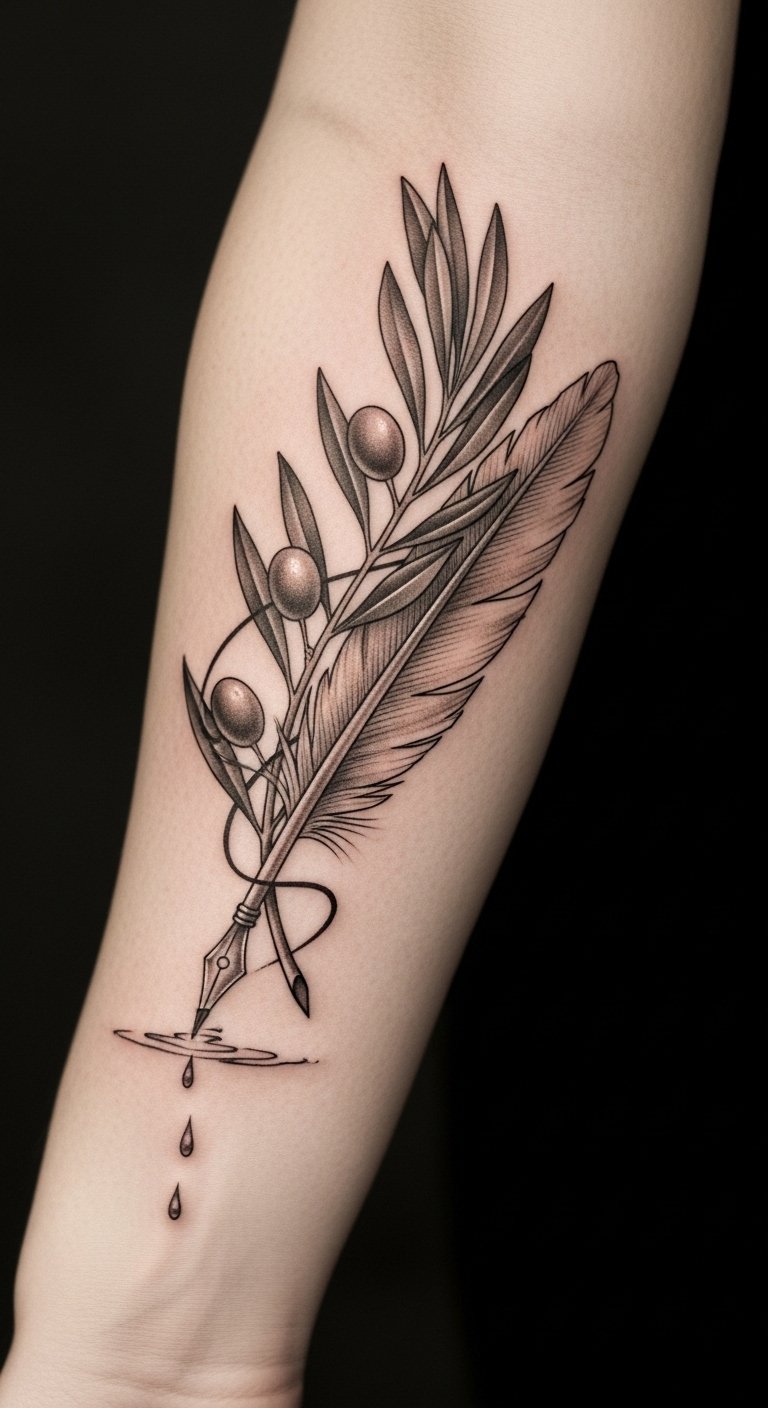 The tattoo’s symbolism lies in the olive branch, a universal emblem of peace, and the quill, representing the power of words and expression. Together, they convey the essence of democratic dialogue and the importance of voices coming together to foster understanding.