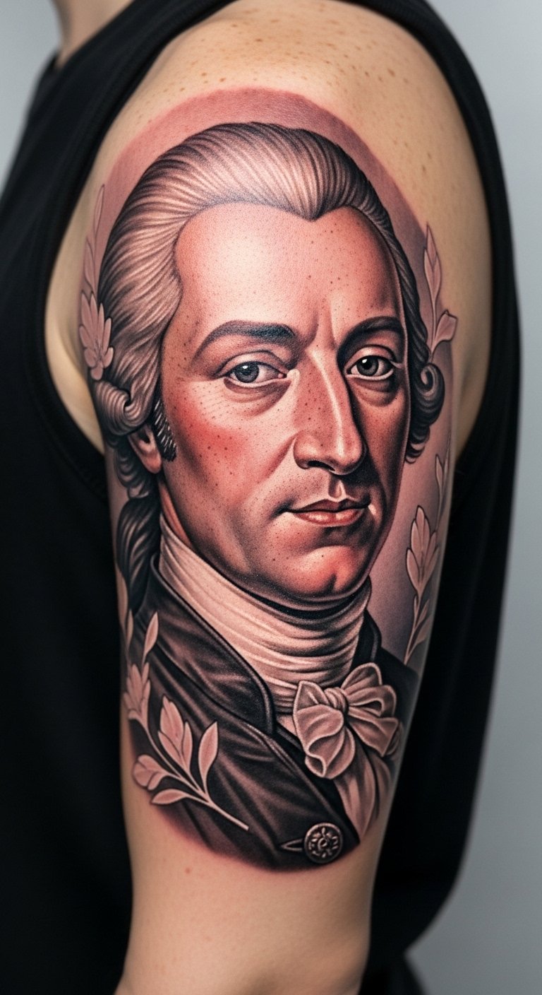 The placement on the upper arm allows for visibility, making it a statement piece that sparks conversations. The floral elements symbolize growth and the passage of time, reflecting the enduring impact of the figure’s legacy.