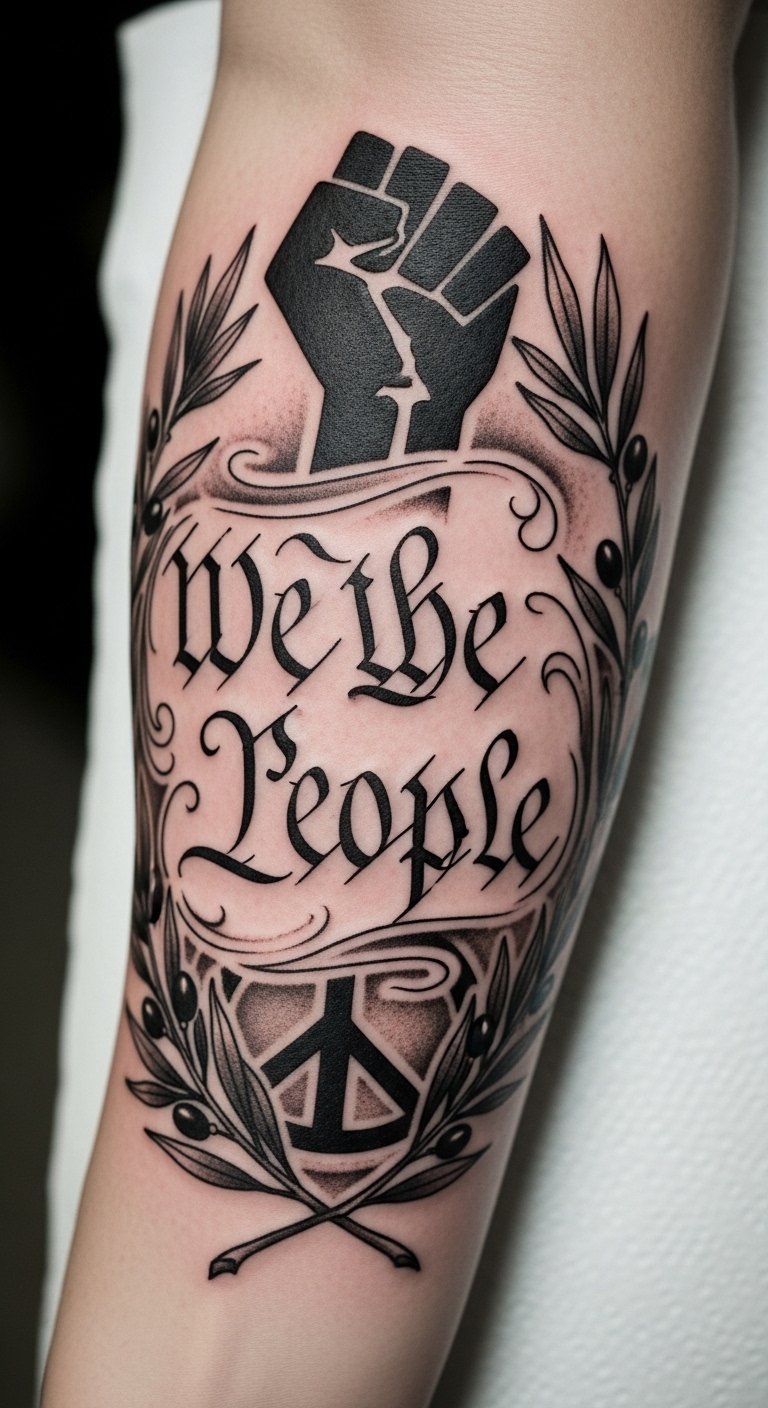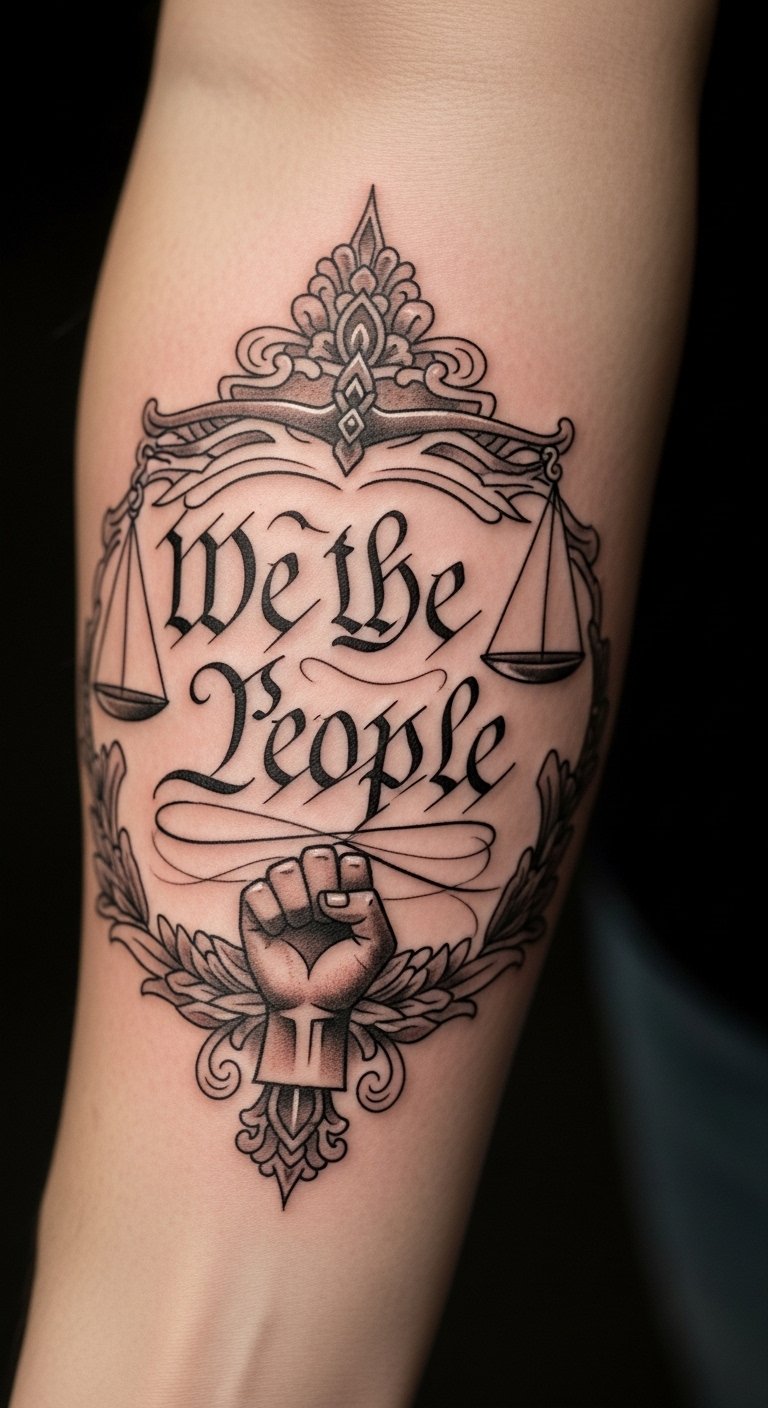 This tattoo design captures the essence of activism and social justice, with “We the People” serving as a powerful mantra for equality and freedom.