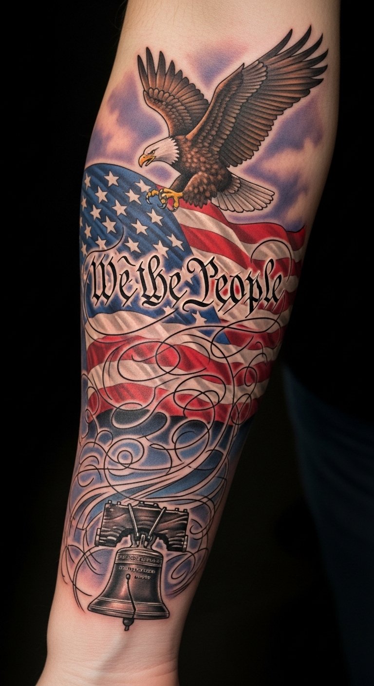 Positioned on the forearm, this tattoo remains visible, serving as a constant reminder of the ideals that shape our nation and your commitment to them.