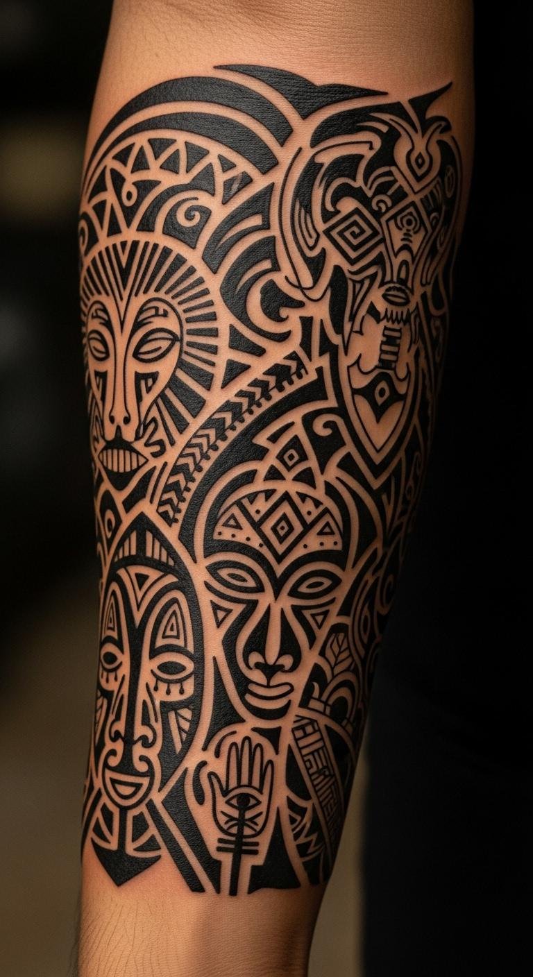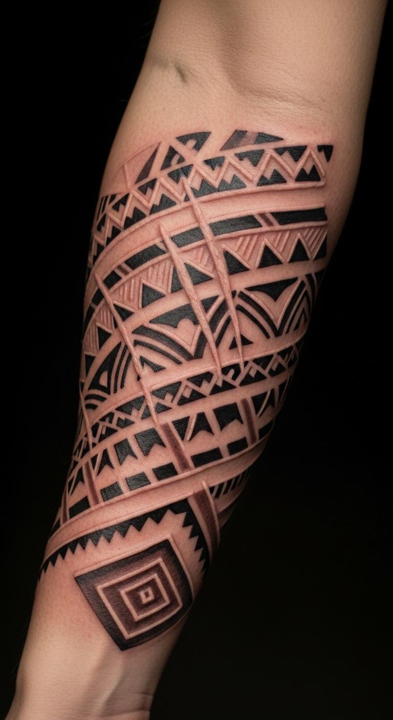 The bold patterns and earthy tones reflect the spiritual beliefs and rituals intertwined with these tattoo traditions, while its placement on the forearm allows for visibility, inviting conversations about identity and cultural significance.