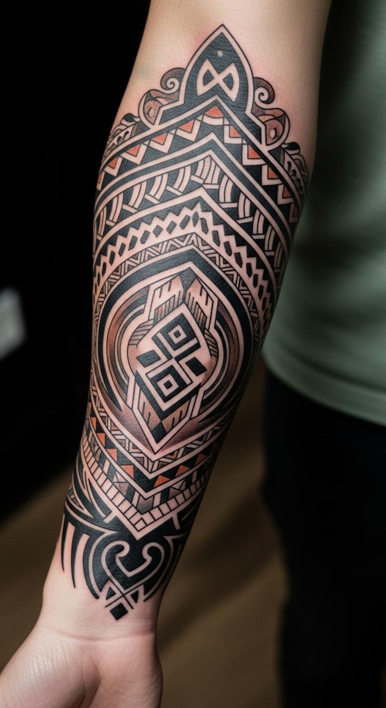 The geometric patterns symbolize structure and balance, while the organic elements reflect growth and transformation. Positioned on the forearm, this location allows for visibility and personal expression, serving as a constant reminder of the wearer’s identity and the protective significance of their cultural traditions.