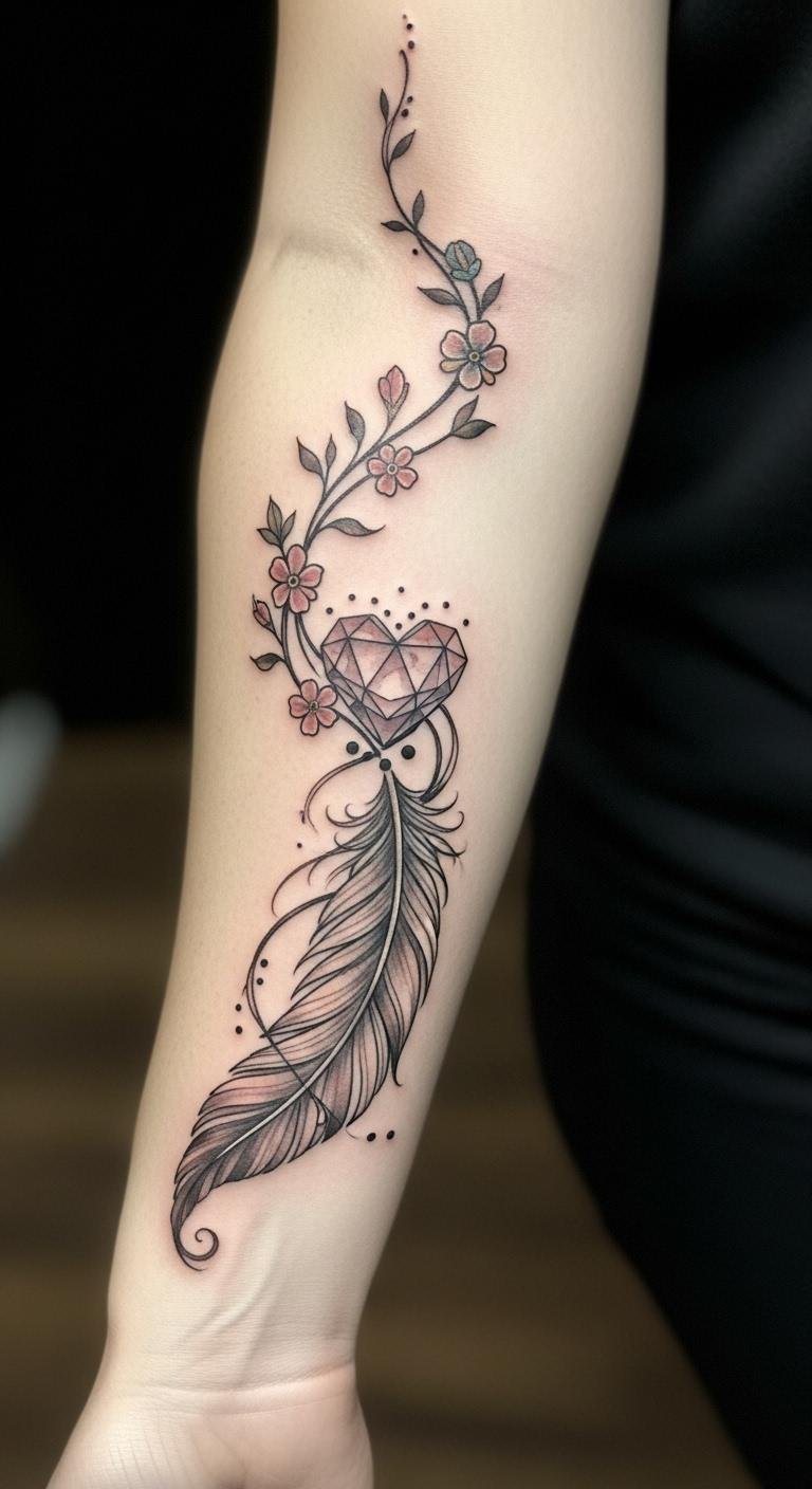 This tattoo symbolizes freedom and growth, with the feather representing a lightness of being and the vine signifying resilience and the journey through life.