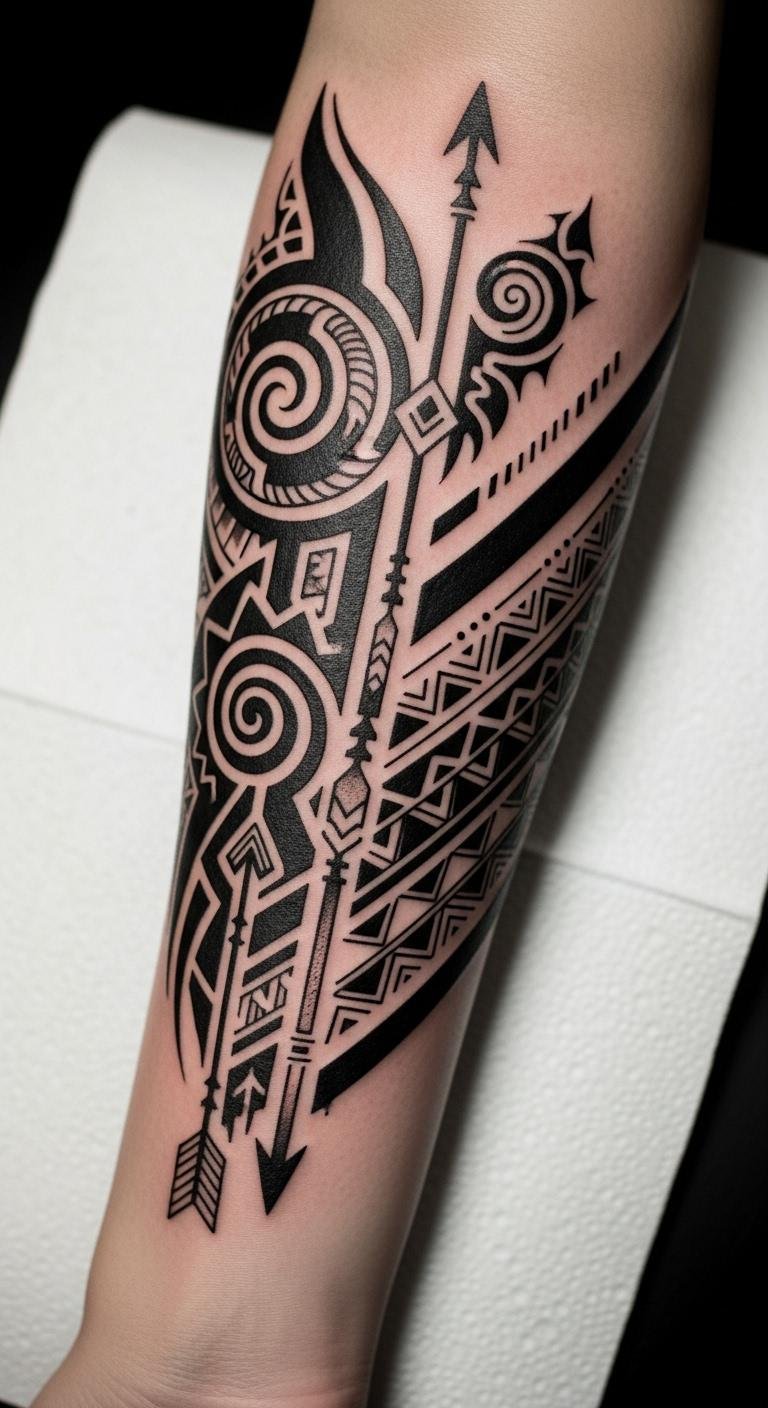 Placed on the forearm, it serves as a constant reminder of one’s roots and the importance of preserving traditional practices. The bold shapes reflect strength and unity, while the flowing lines signify the interconnectedness of heritage and modern identity.