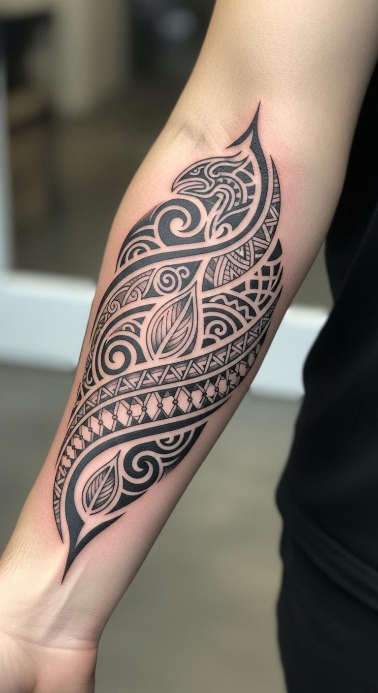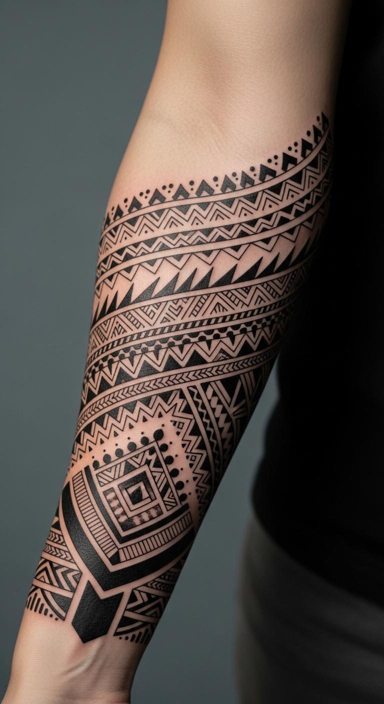 These tribal patterns, inked on the forearm, tell a story of cultural heritage and personal identity, symbolizing resilience and belonging.