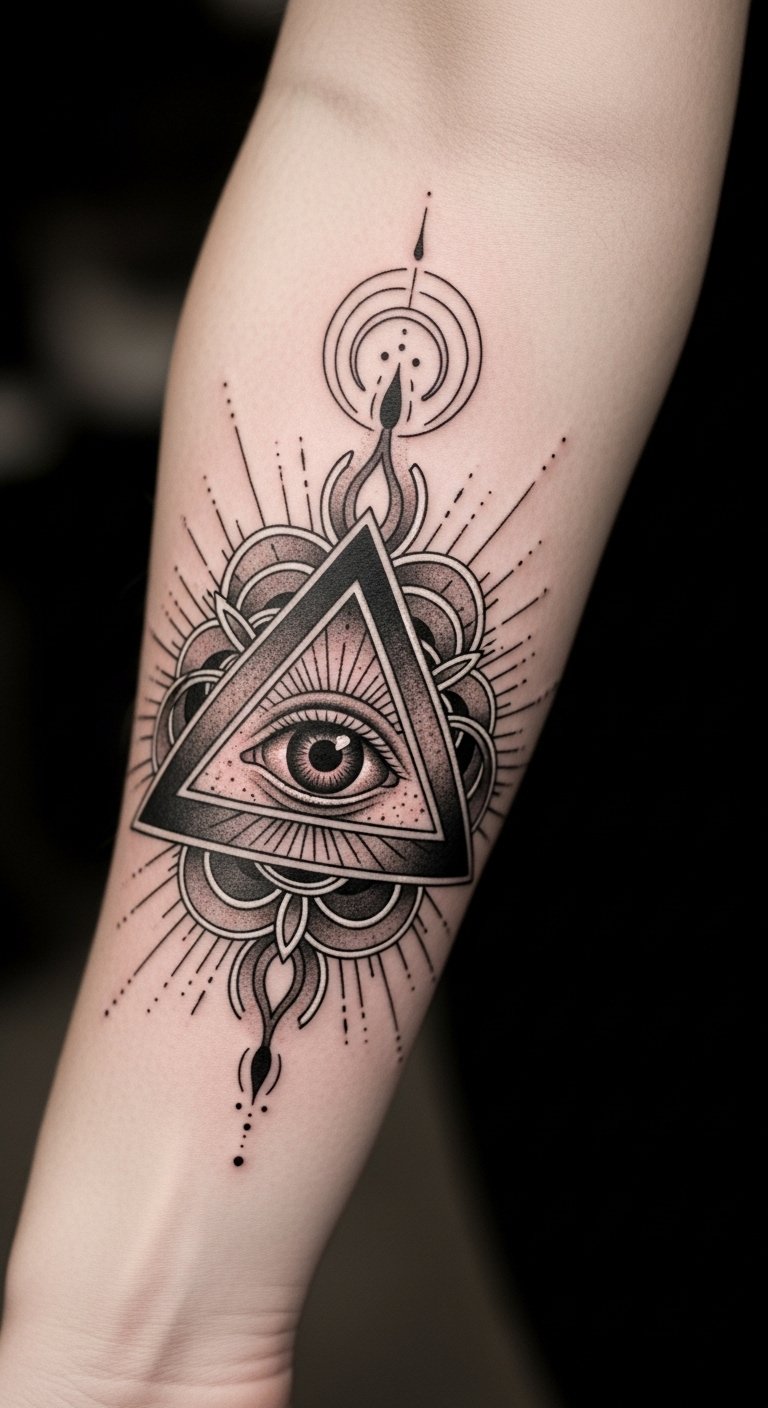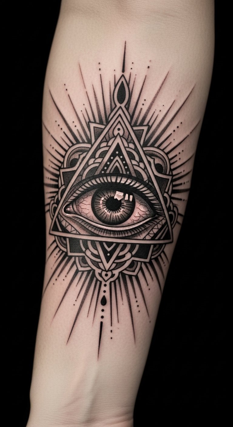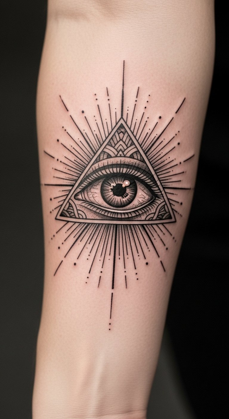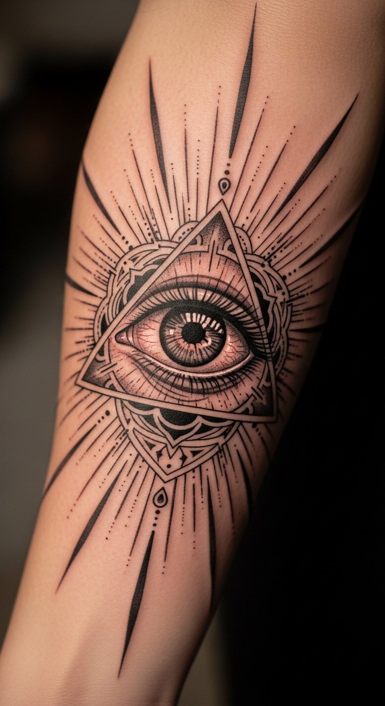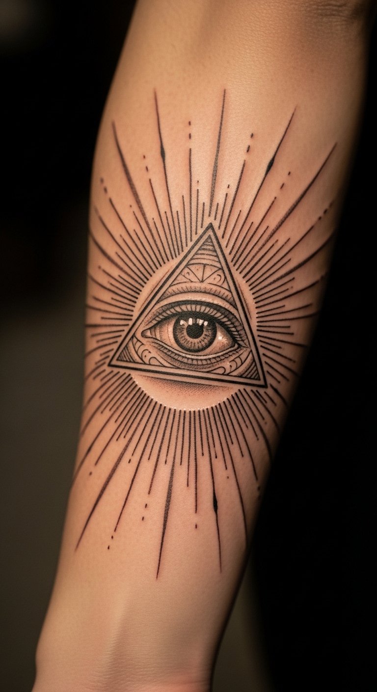 The All Seeing Eye tattoo on the forearm serves as a daily reminder to seek truth and clarity in one’s spiritual journey.