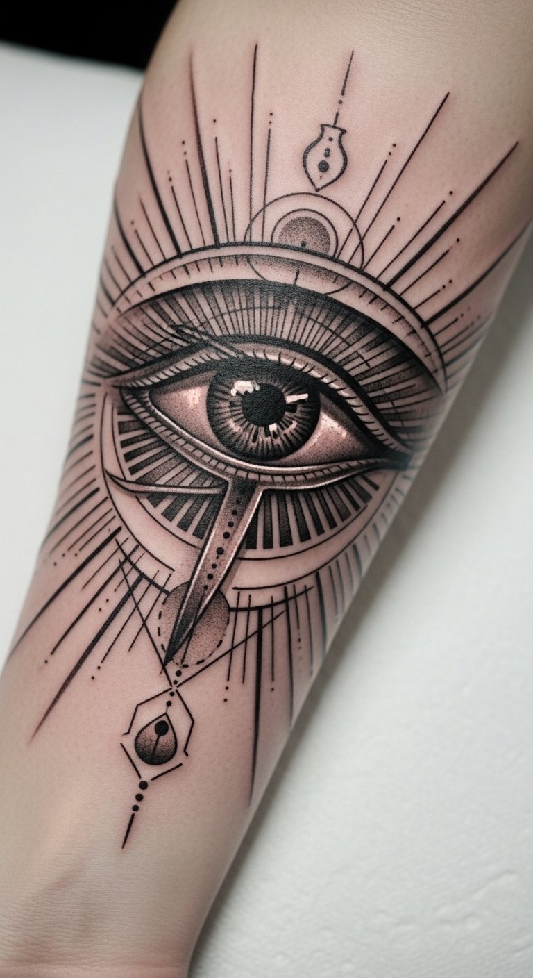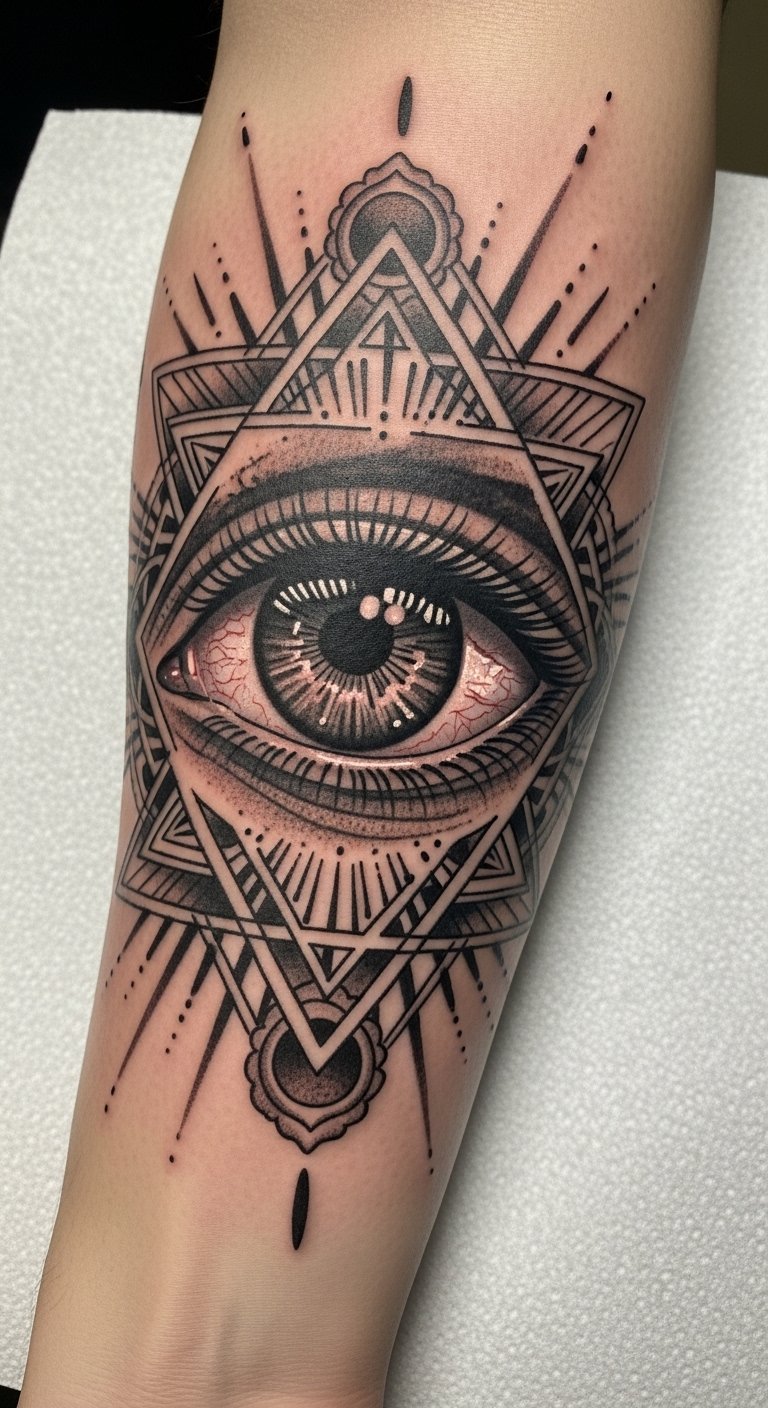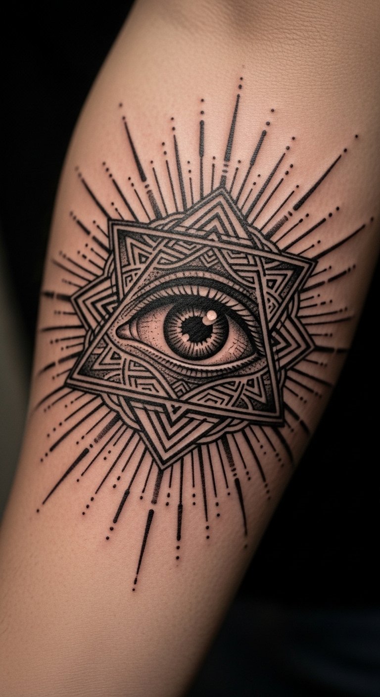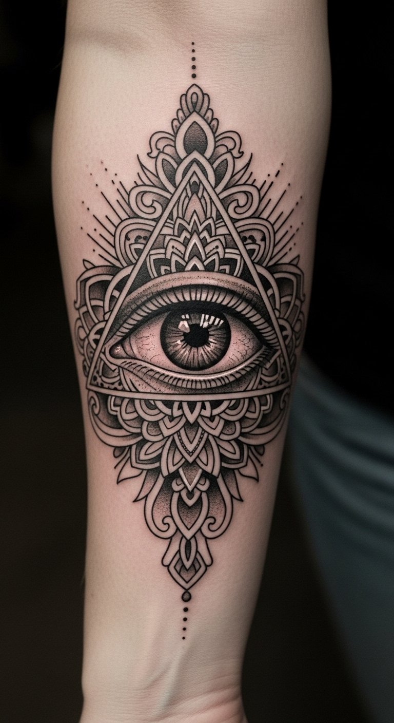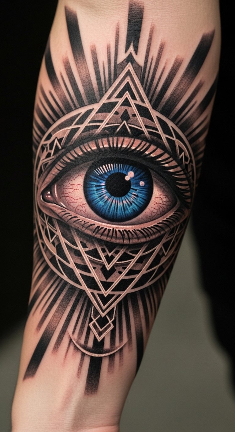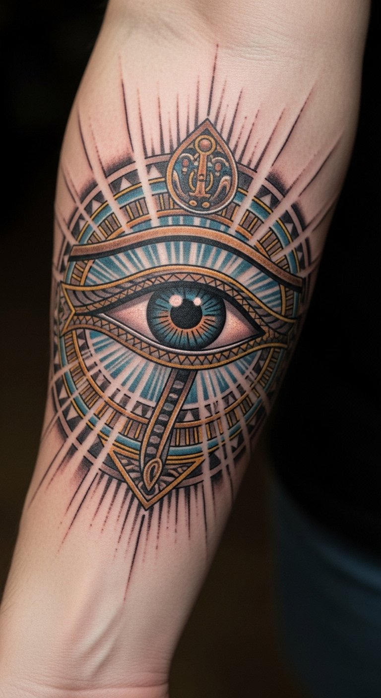 The All Seeing Eye tattoo on the forearm serves as a daily reminder to seek truth and clarity in one’s spiritual journey.