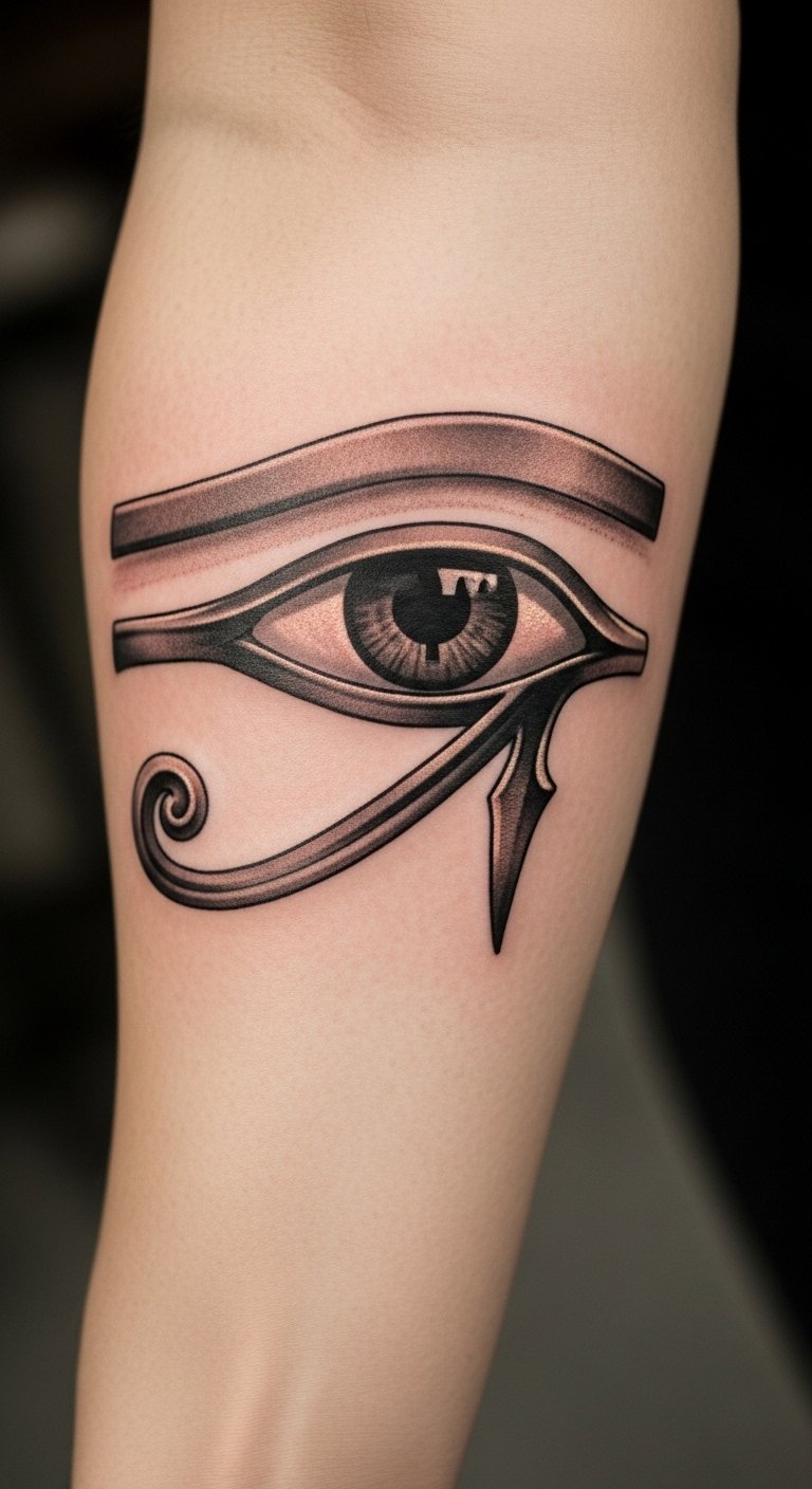 The Eye of Horus tattoo on the forearm serves as a constant reminder of strength and spiritual resilience. This placement allows for visibility, inviting curiosity and conversations about its deep-rooted significance in Egyptian mythology.