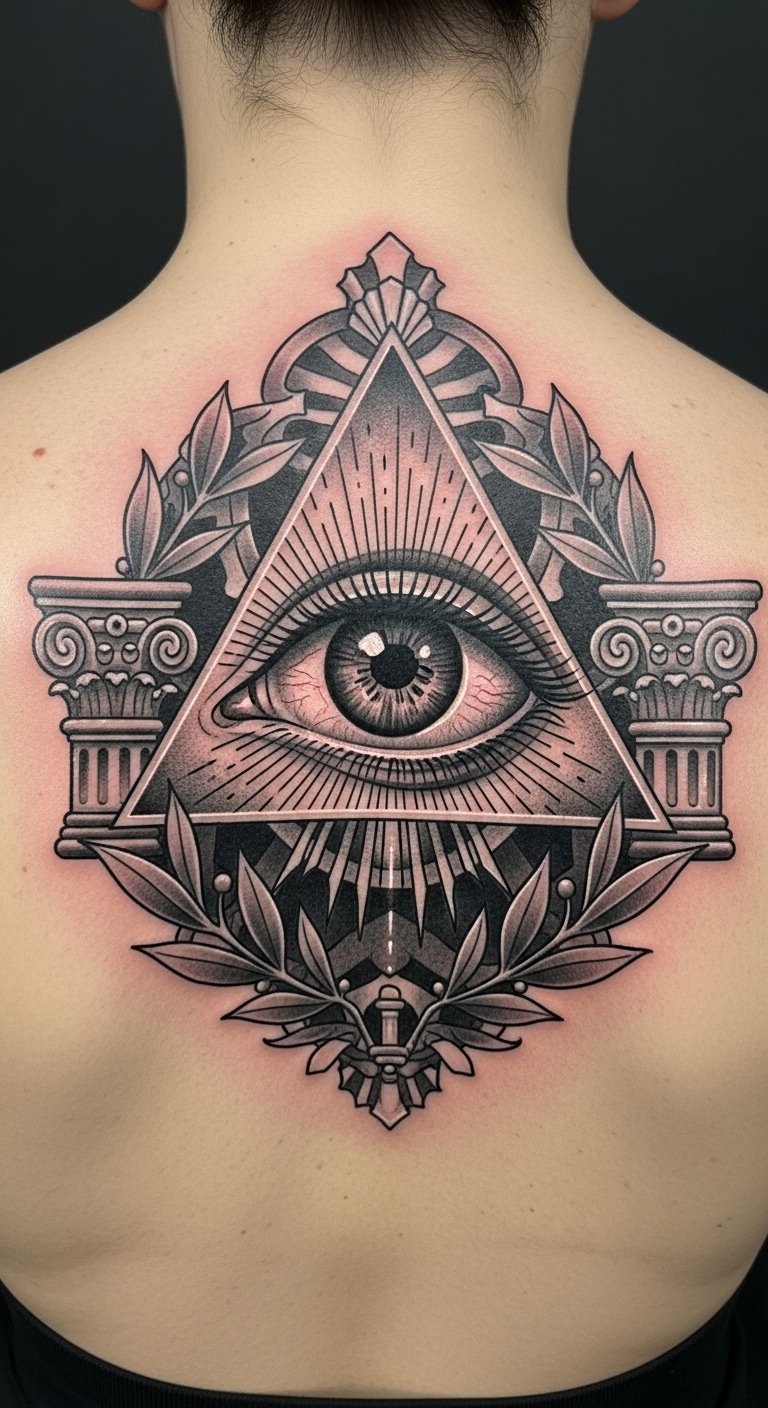 This All Seeing Eye tattoo on the upper back signifies spiritual protection and the pursuit of profound understanding.