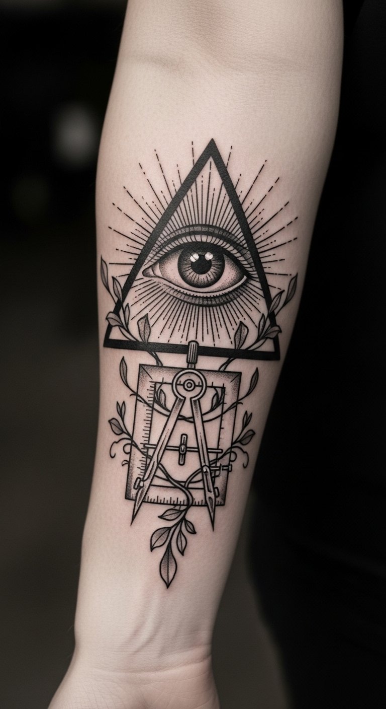 The All Seeing Eye tattoo on the forearm serves as a powerful reminder of self-awareness and enlightenment. Positioned prominently, it invites introspection and serves as a daily touchstone for inner wisdom.