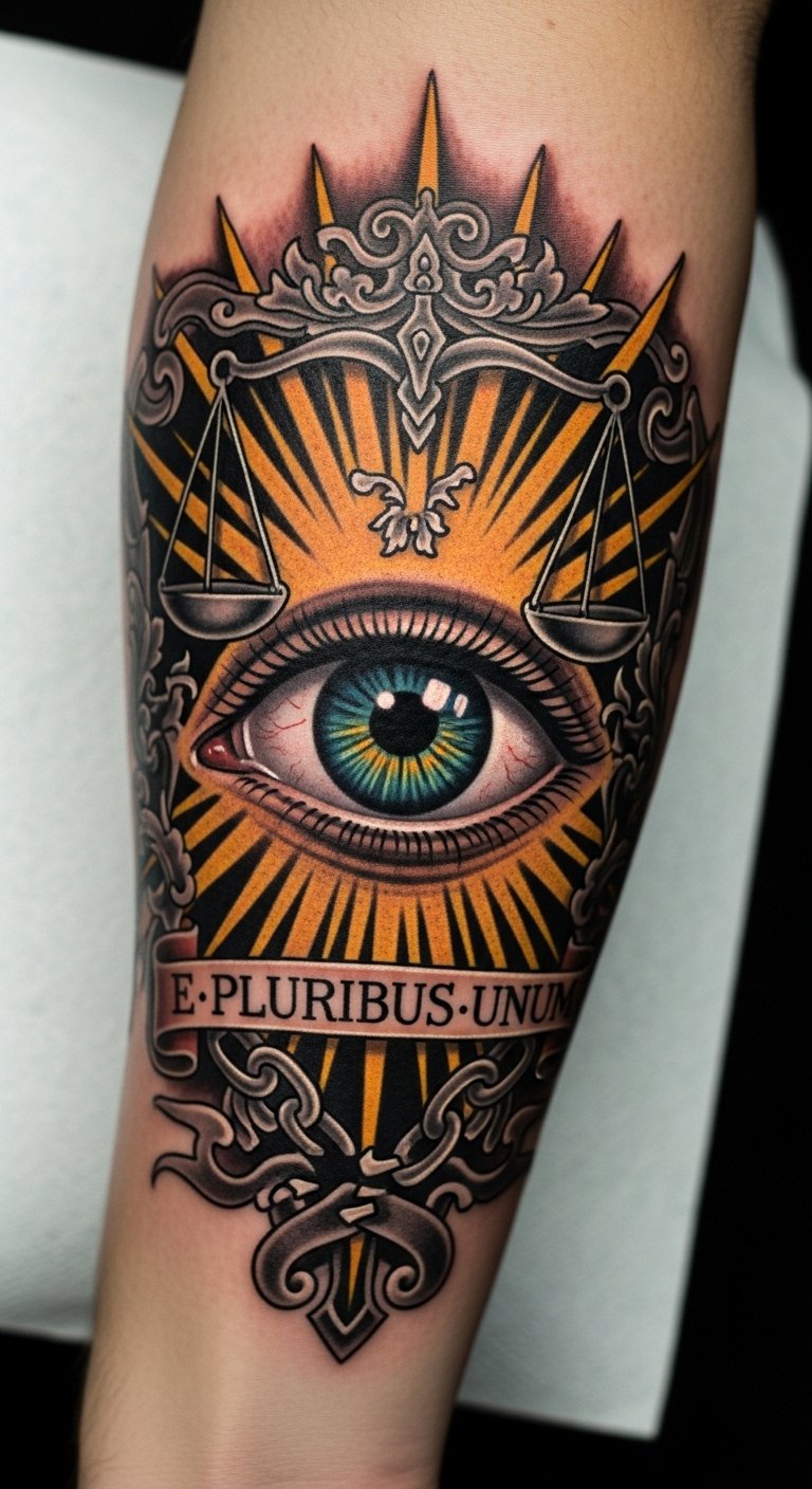 This tattoo serves as a striking reminder of divine guidance and oversight, embodying the principles of liberty and justice.