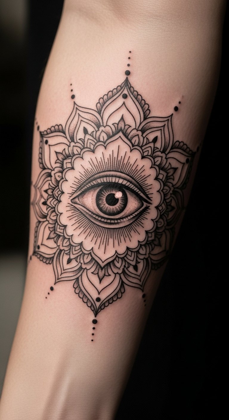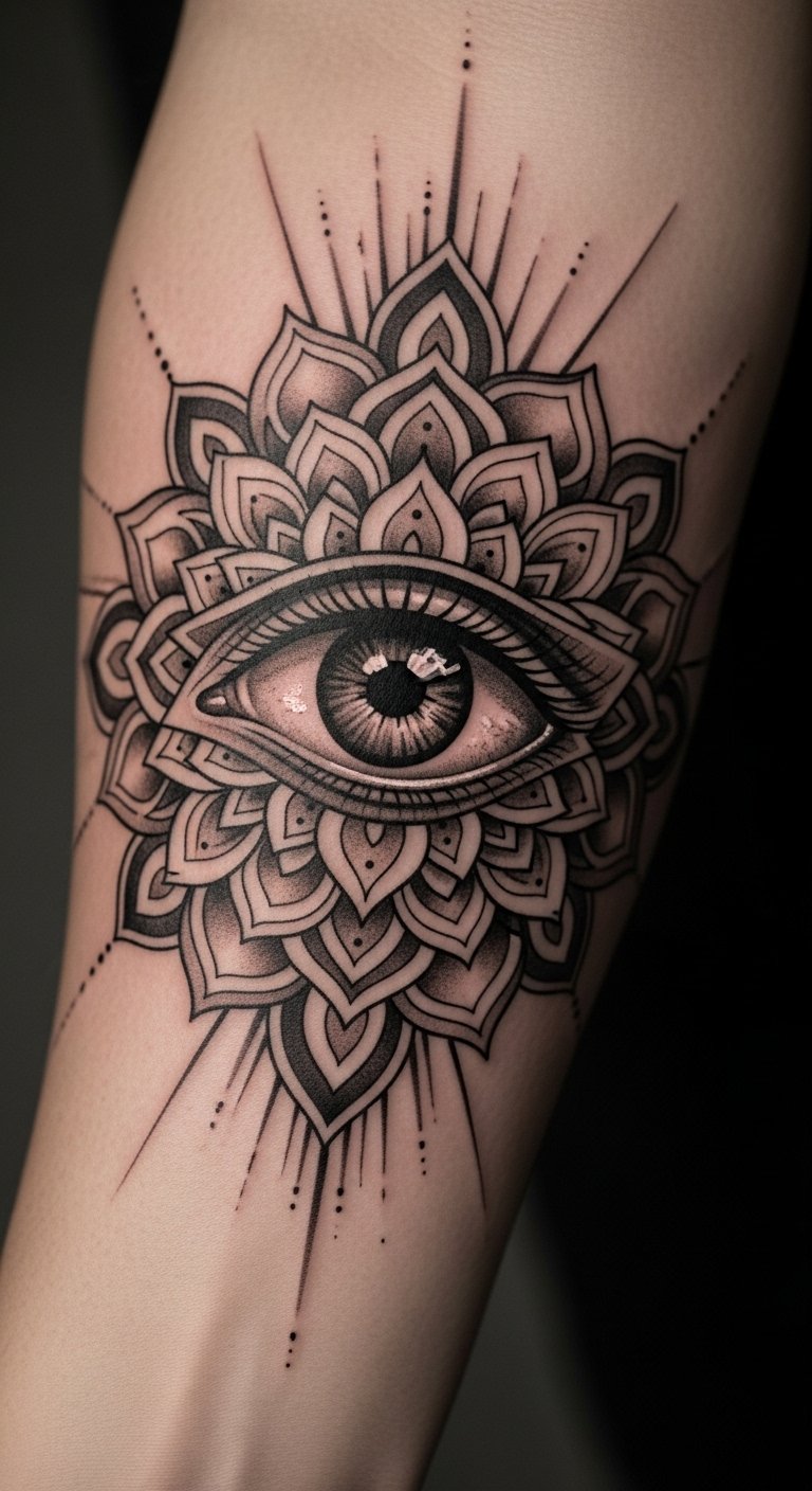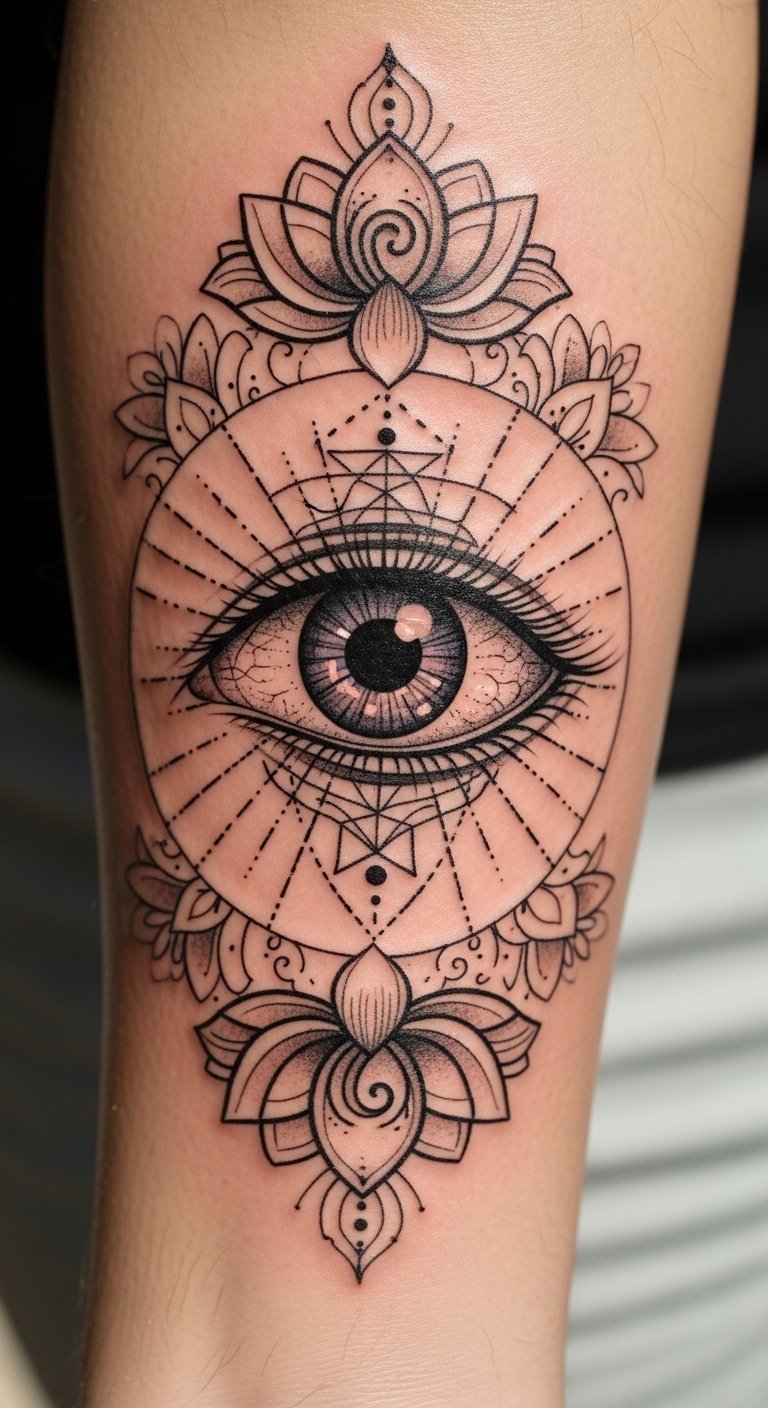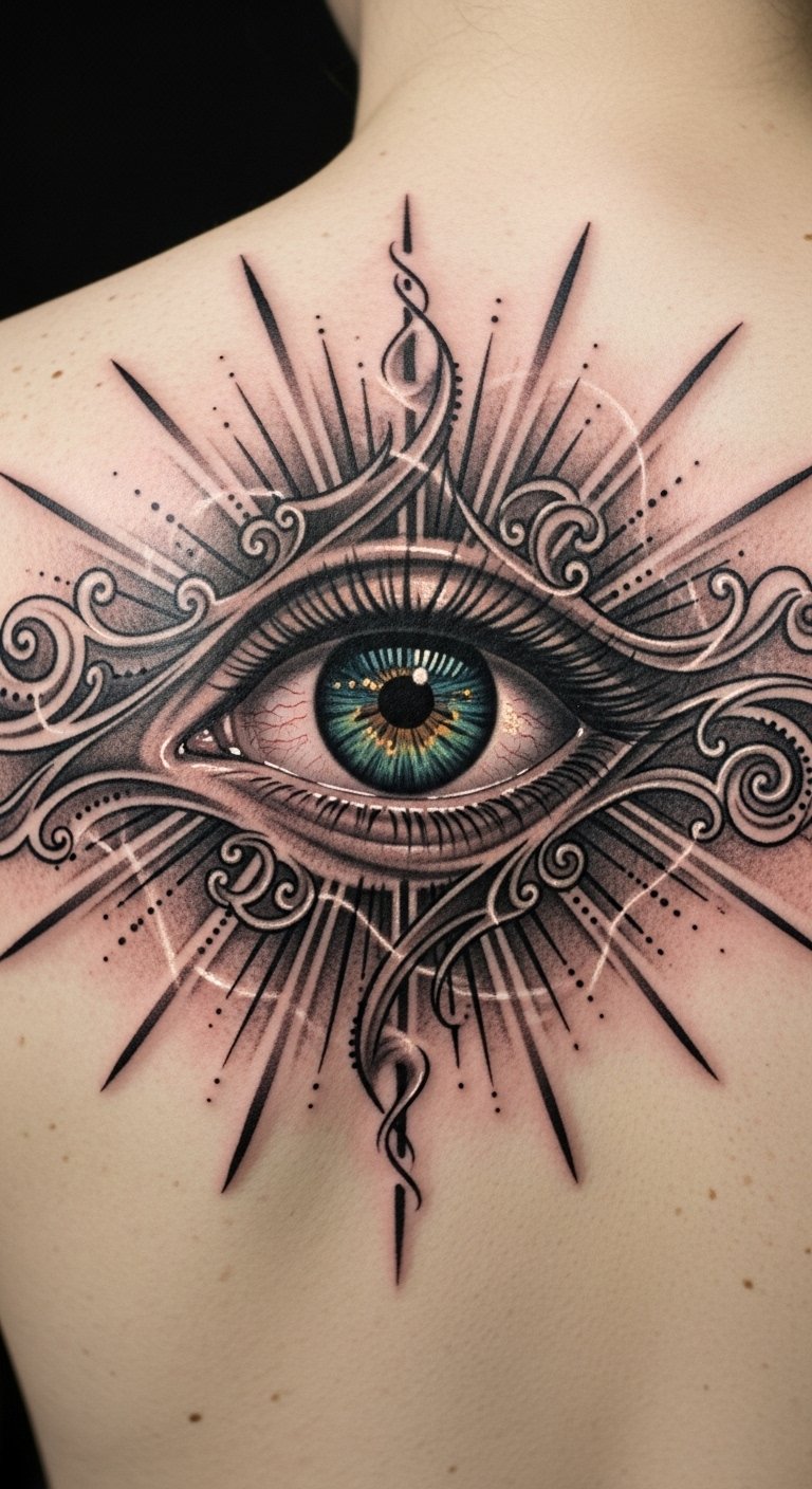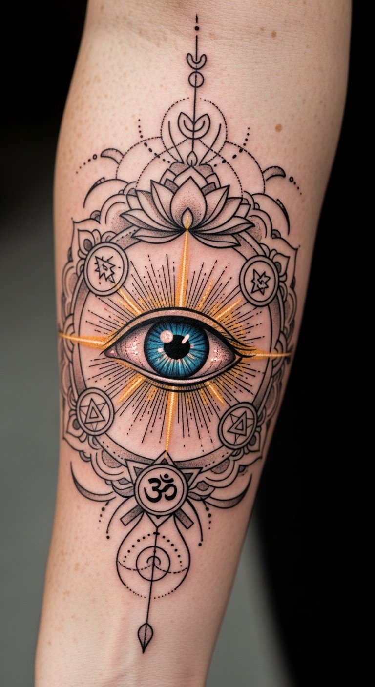 This tattoo symbolizes spiritual enlightenment and the ability to perceive deeper truths beyond the ordinary.