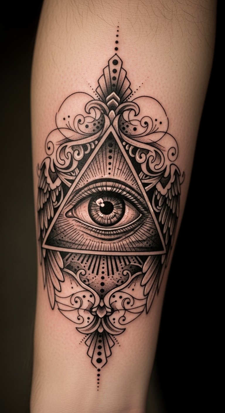 This tattoo symbolizes awareness and spiritual insight, drawing from the rich historical significance of the All Seeing Eye.