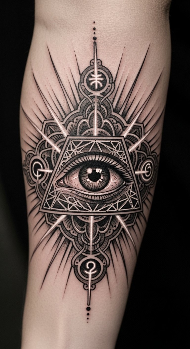 Inked on the forearm, it remains visible, allowing for daily reminders of self-awareness and the pursuit of truth. The surrounding geometric patterns enhance the mystical essence of the design, evoking a sense of connection to the divine and the universe.