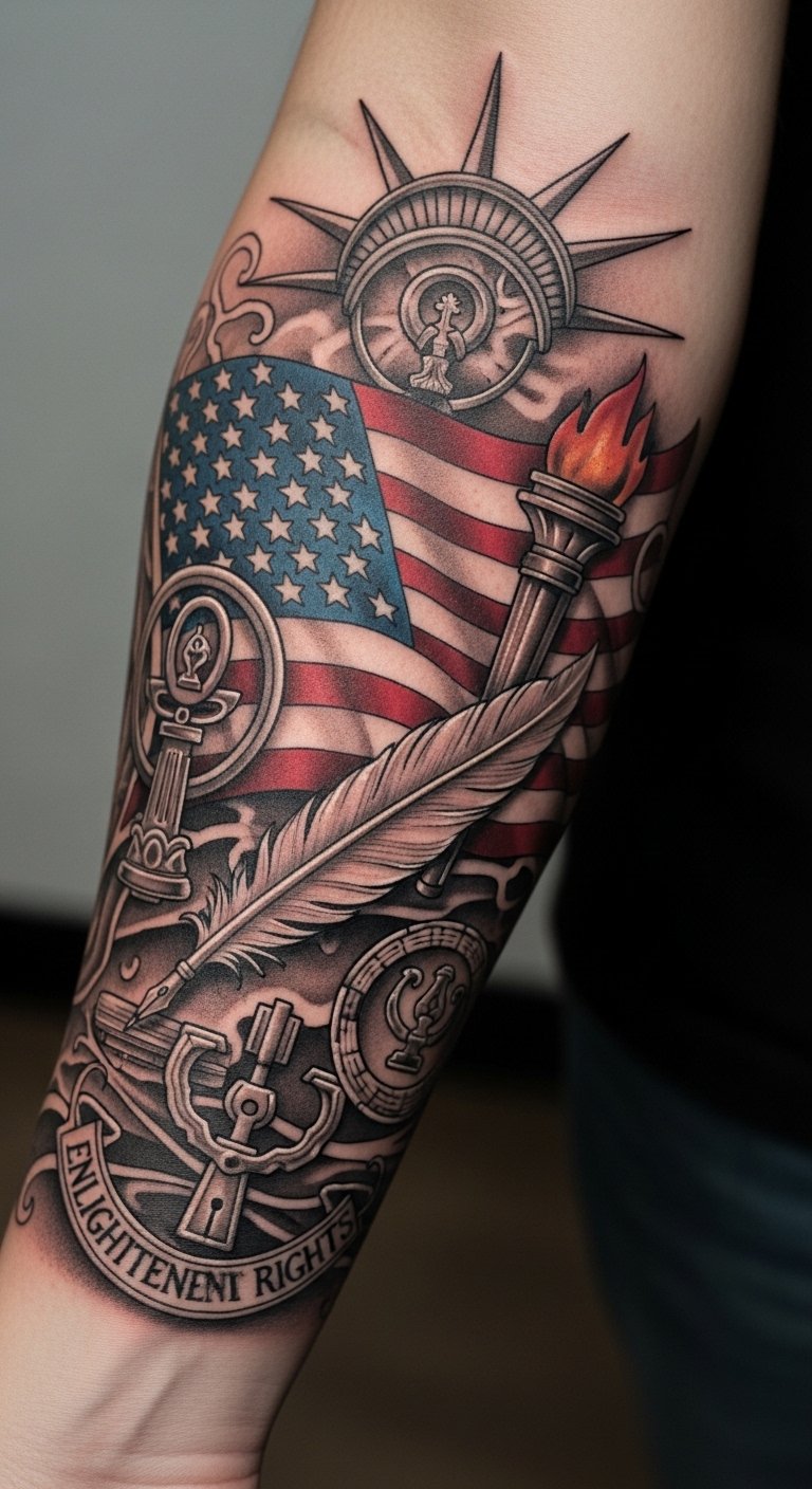 This tattoo symbolizes the foundational principles of American culture, intertwining liberty and democracy with personal identity.