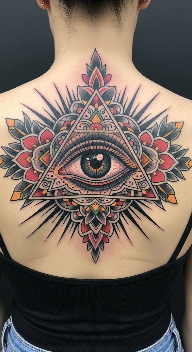 Its placement on the upper back allows for both visibility and concealment, symbolizing the idea of always watching over oneself. The intricate geometric patterns and floral designs add depth and personal meaning, representing a connection to history and a unique identity.