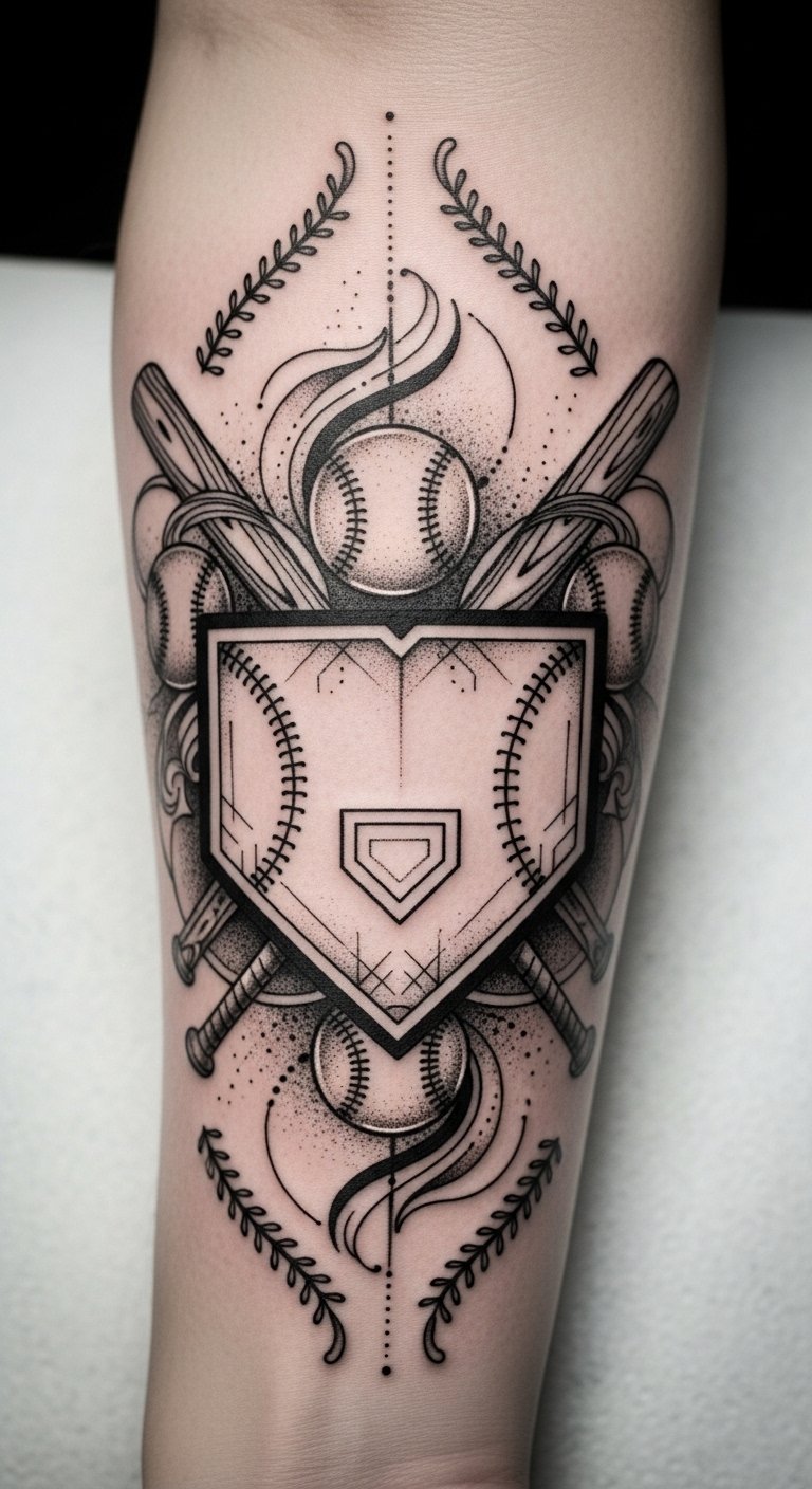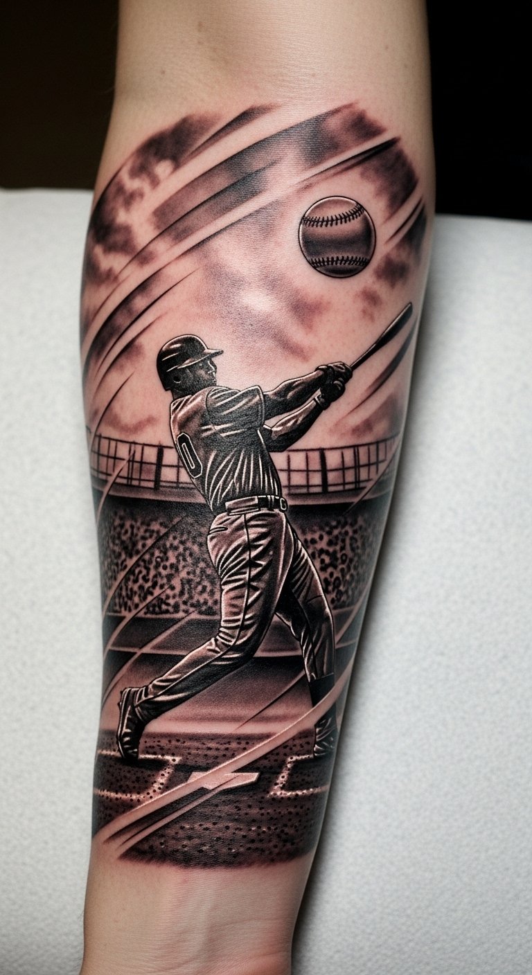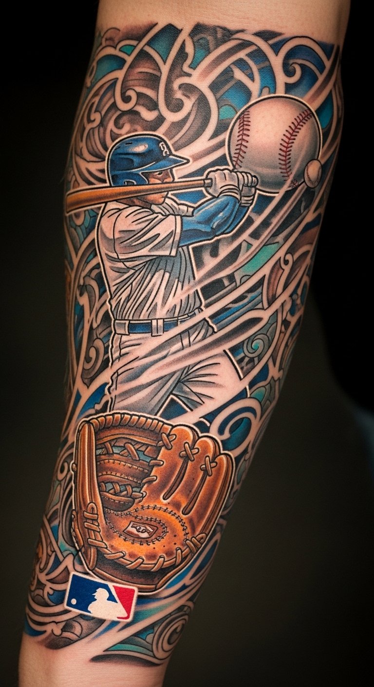 The dynamic elements evoke emotions tied to iconic moments in baseball, while the intricate patterns represent the complexity of the sport, making it not just a tattoo, but a narrative of identity and purpose.