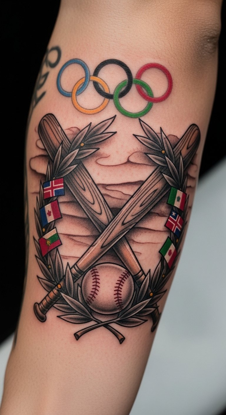 This tattoo symbolizes the unity and diversity found in Olympic baseball, celebrating the spirit of competition and cultural exchange.