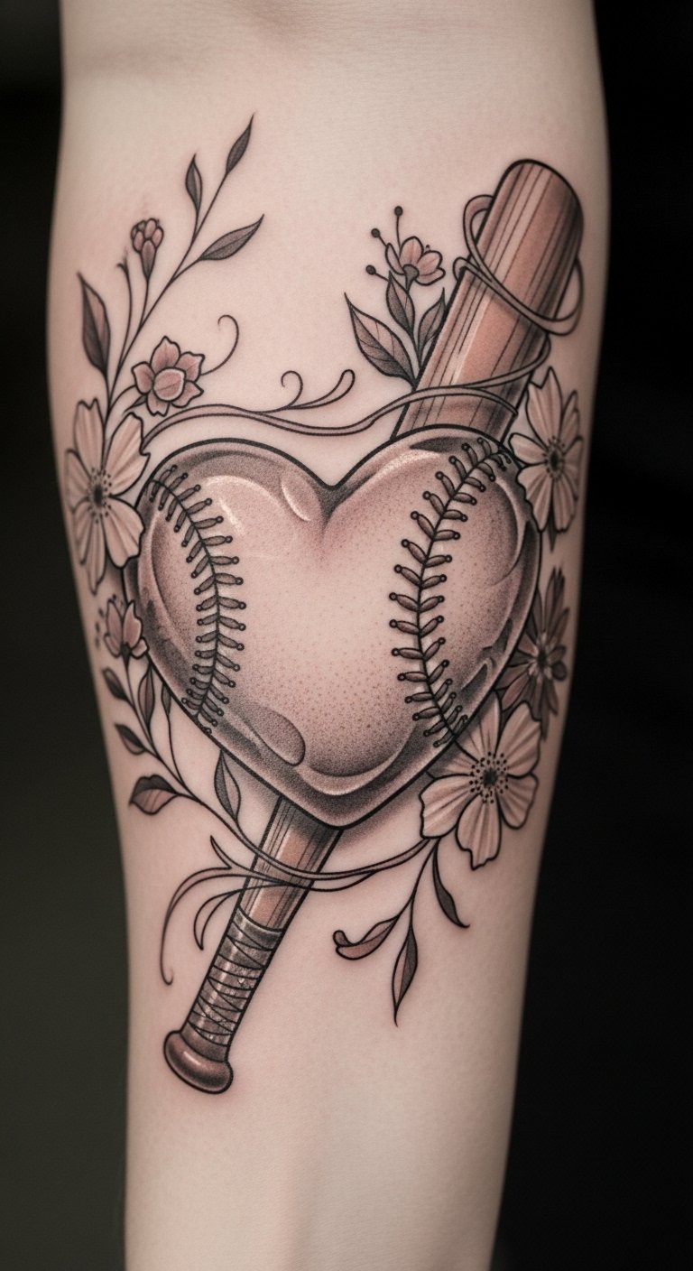 This tattoo design beautifully captures the essence of baseball love, intertwining the heart and bat to signify unwavering devotion to the game.