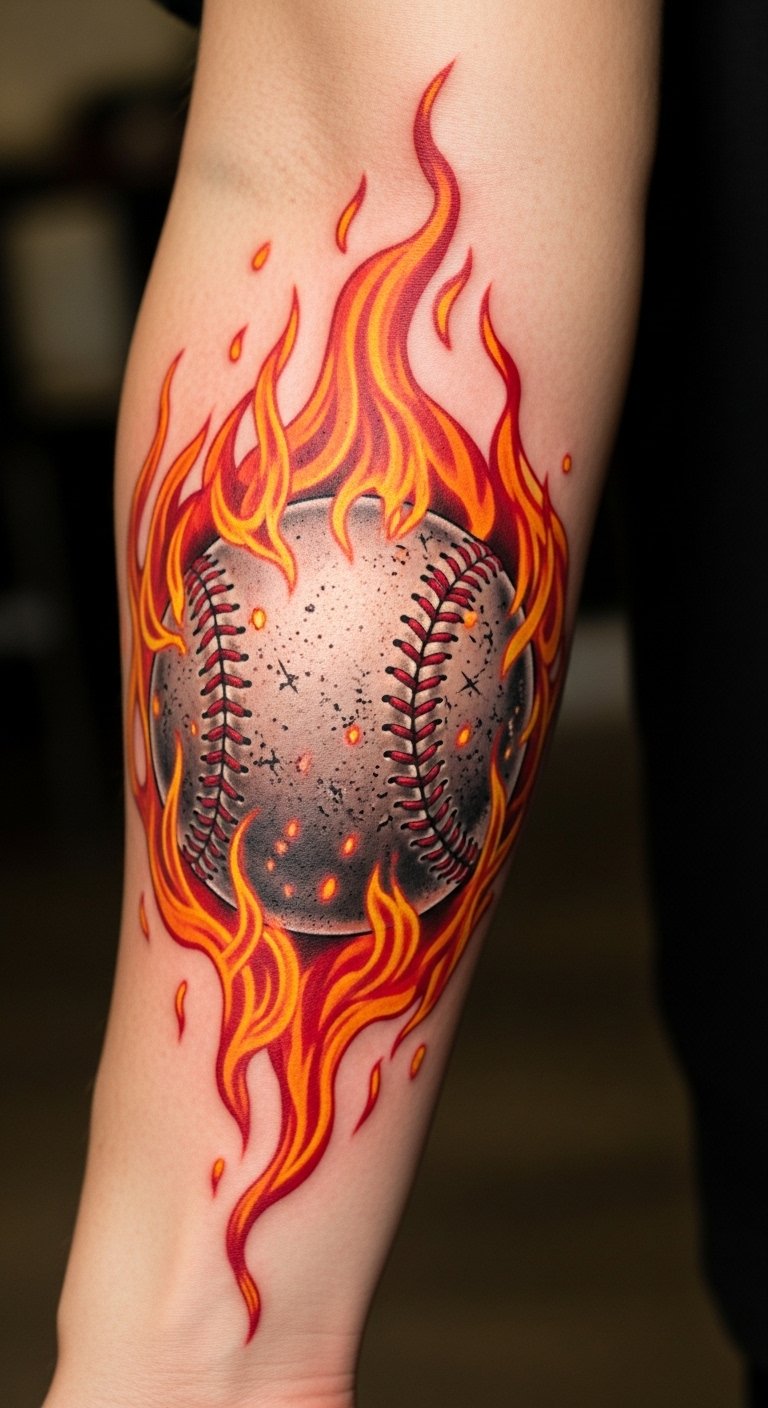 This fiery baseball tattoo on the forearm serves as a powerful symbol of passion and dedication to the game. The flames represent the intensity and love for baseball, reflecting a relentless spirit that drives the wearer.