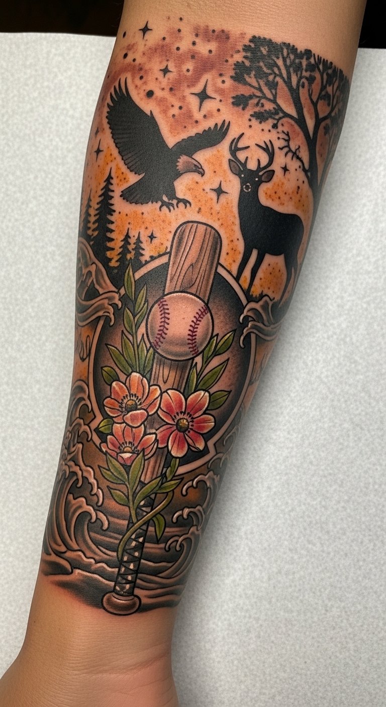 The tattoo symbolizes the harmony between the love for baseball and the beauty of nature, reflecting a deep personal connection to both.