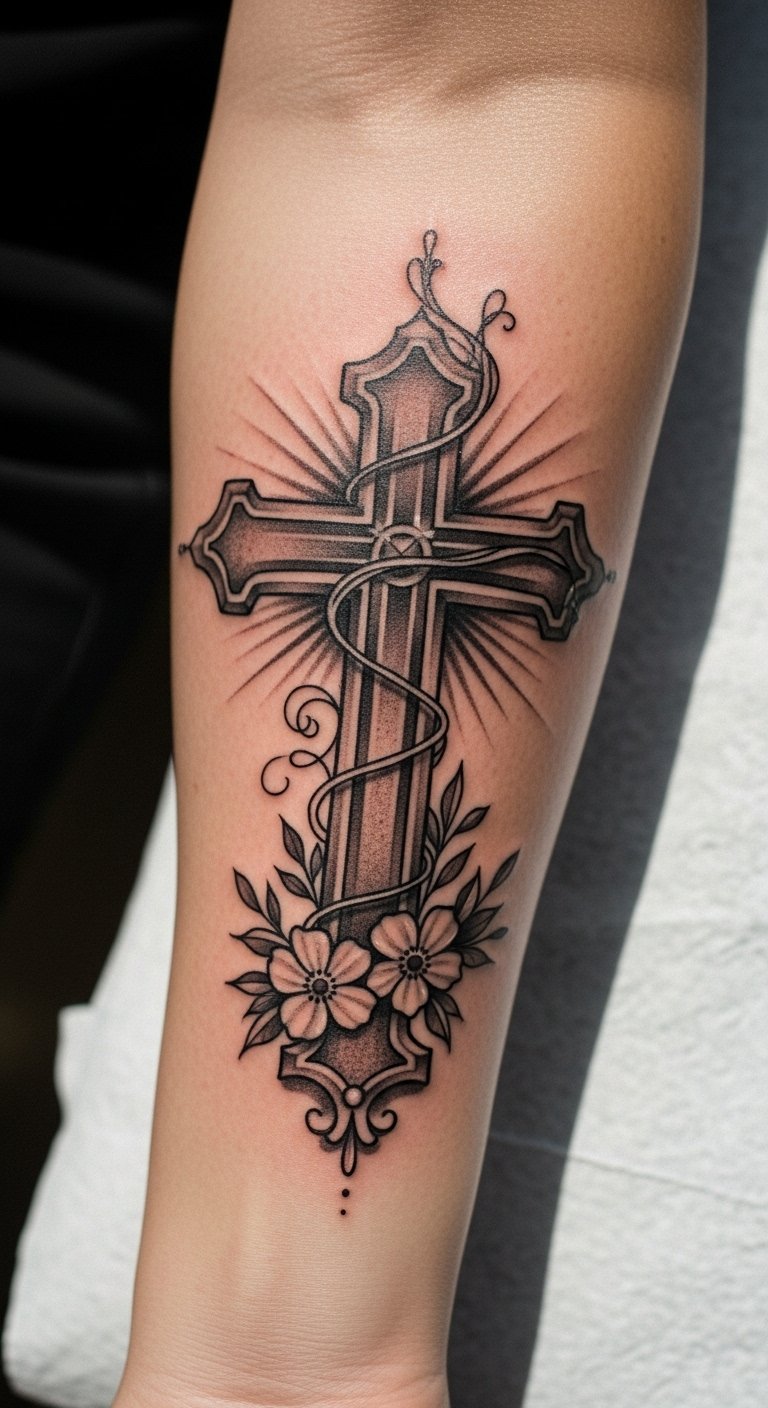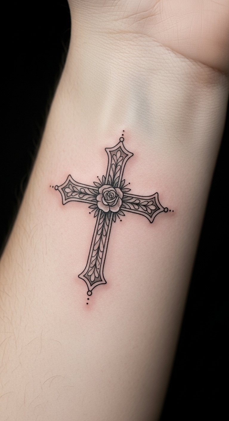 This cross tattoo on the inner forearm symbolizes faith and personal transformation, making it a constant reminder of one’s beliefs and values.