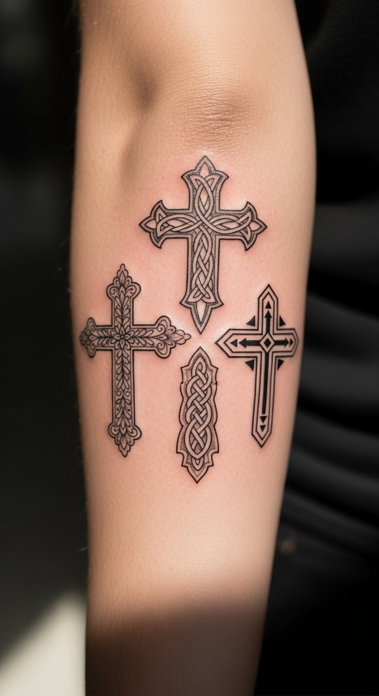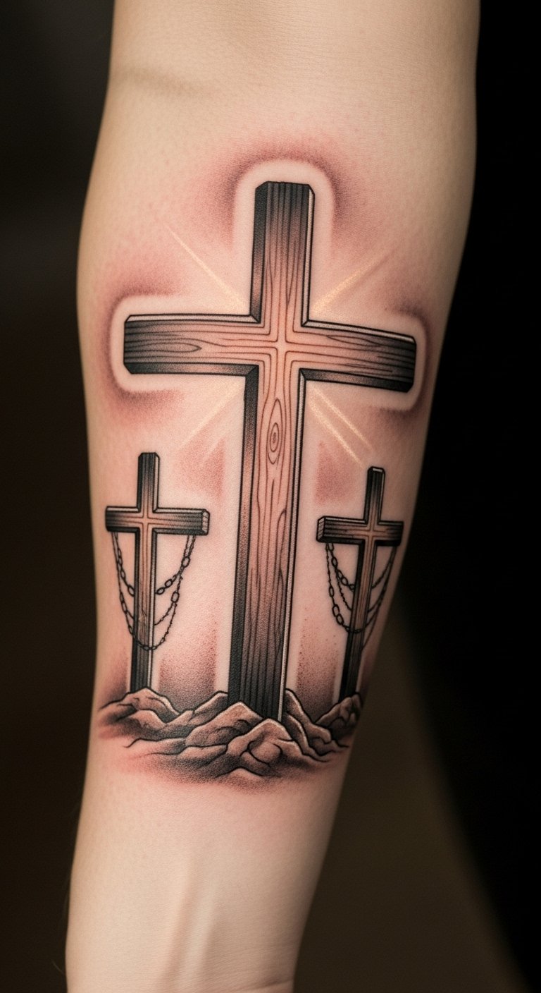 The three crosses tattoo on the forearm serves as a visible testament to one’s faith journey, embodying emotional healing and spiritual reflection.