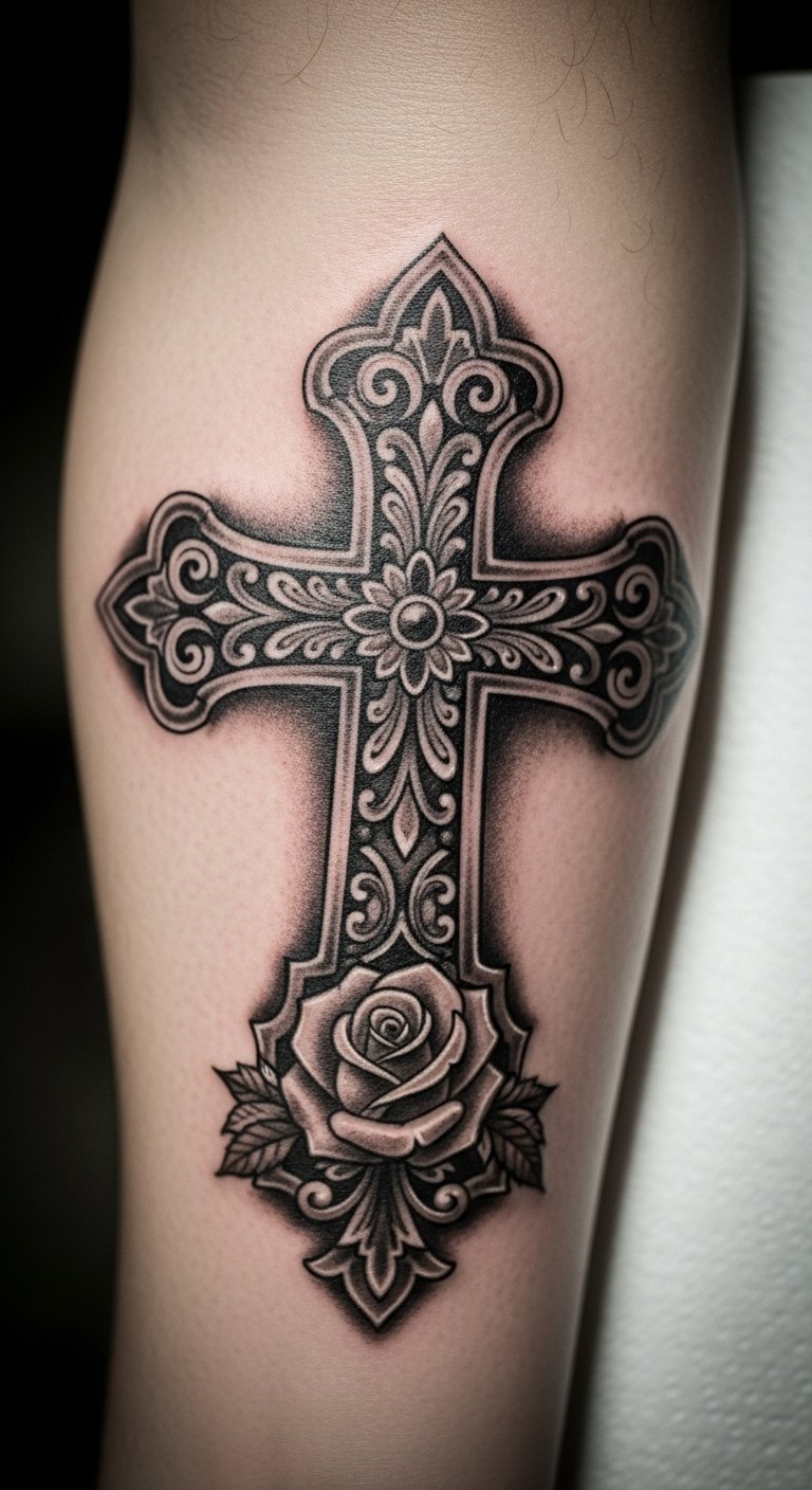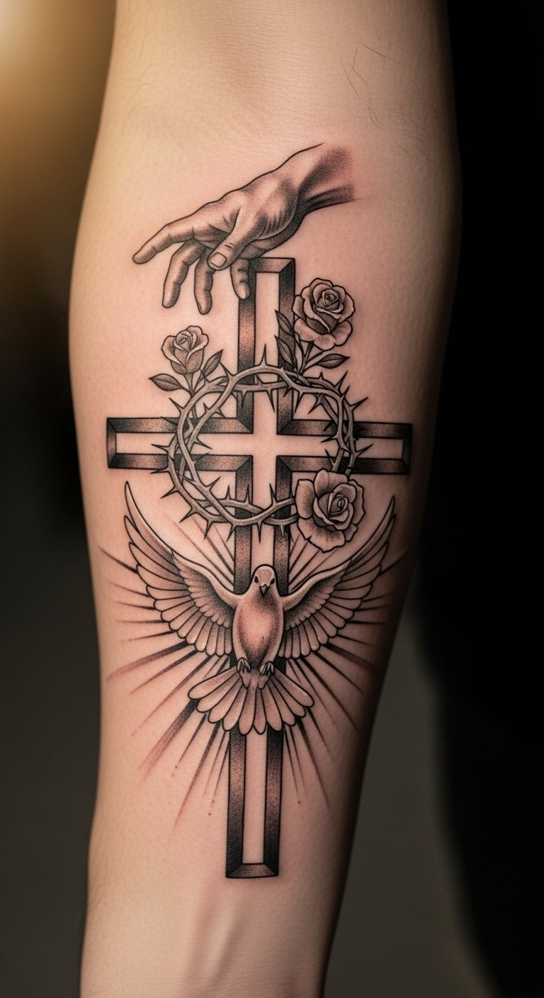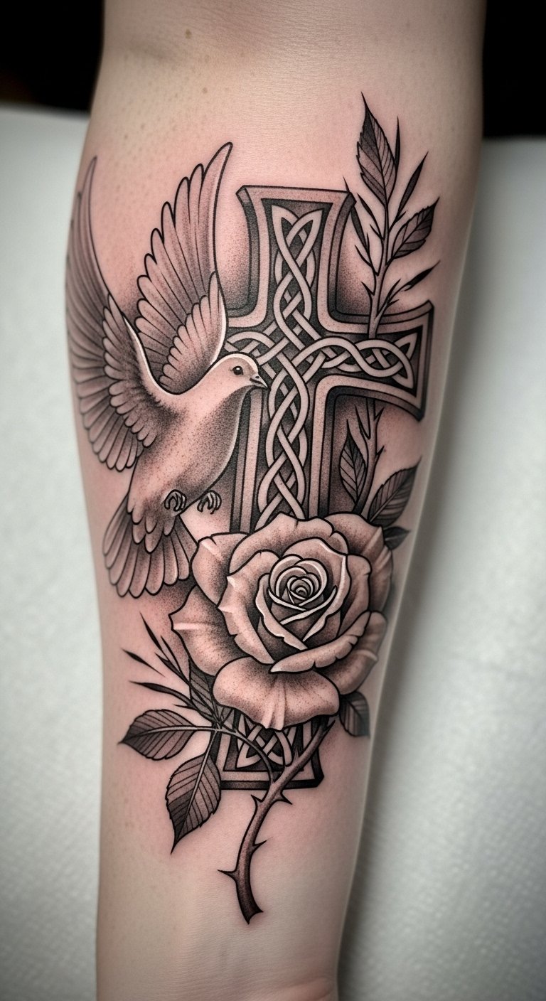 This tattoo symbolizes faith and hope, with the cross representing a deep spiritual connection. The dove embodies peace and the rose signifies love and resilience.