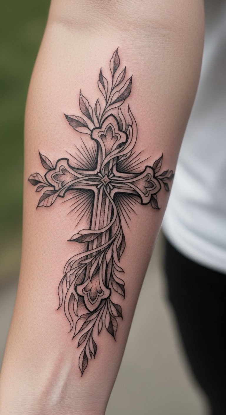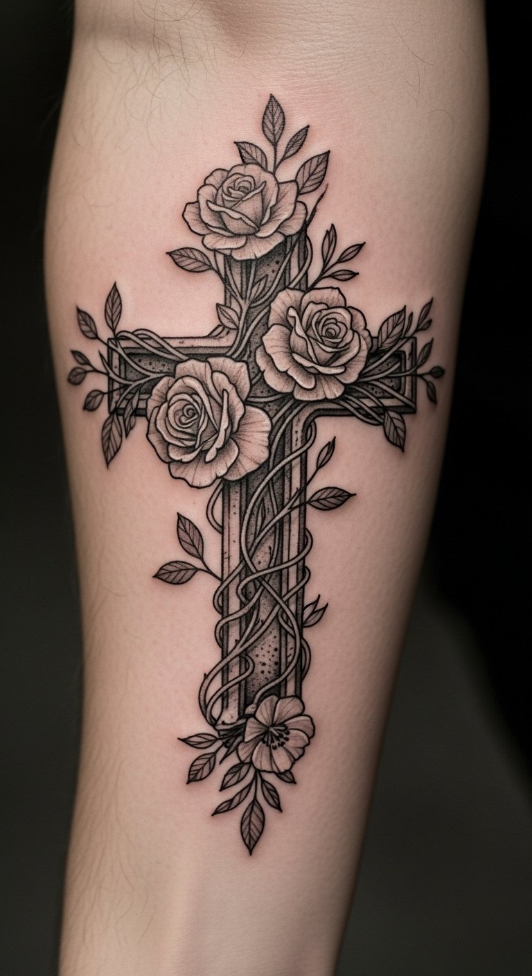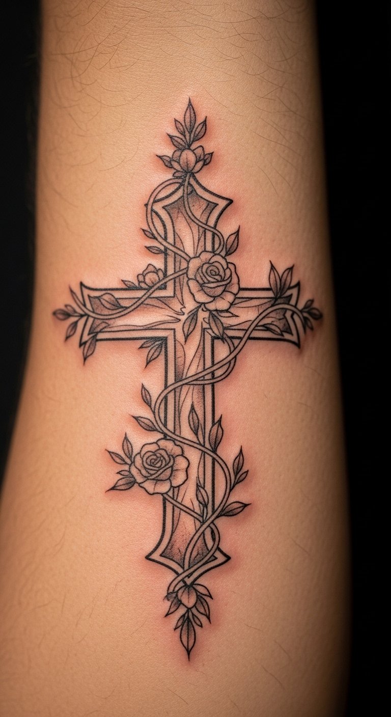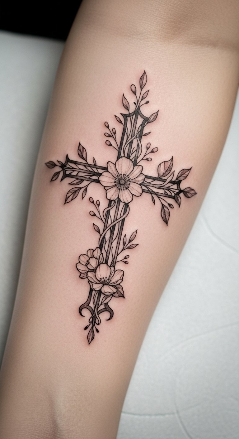 The cross, central to Christian theology, symbolizes sacrifice, while the surrounding vines and flowers represent resilience and personal growth.