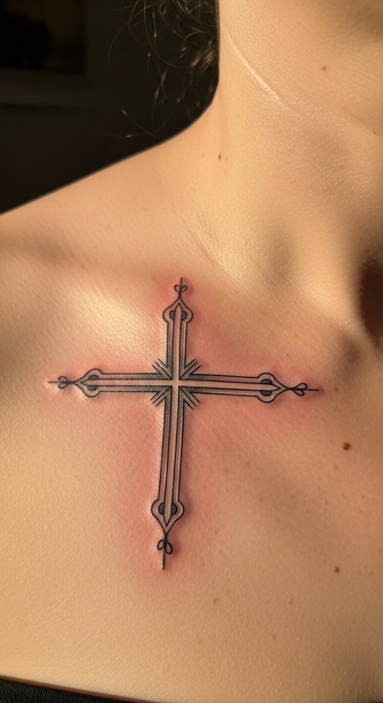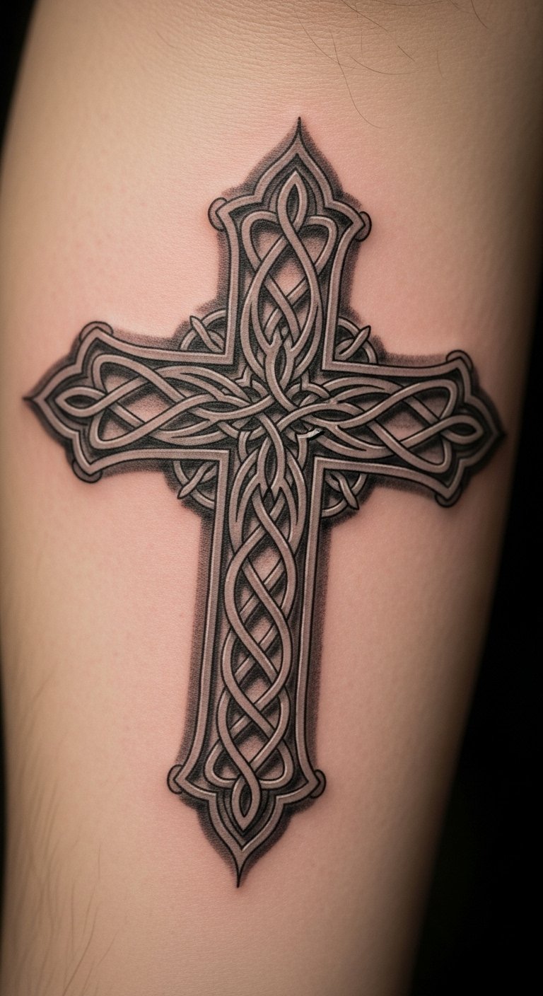 The intricate details celebrate the rich history of the cross, while the natural skin tone adds authenticity, allowing the tattoo to resonate deeply with the individual’s story.
