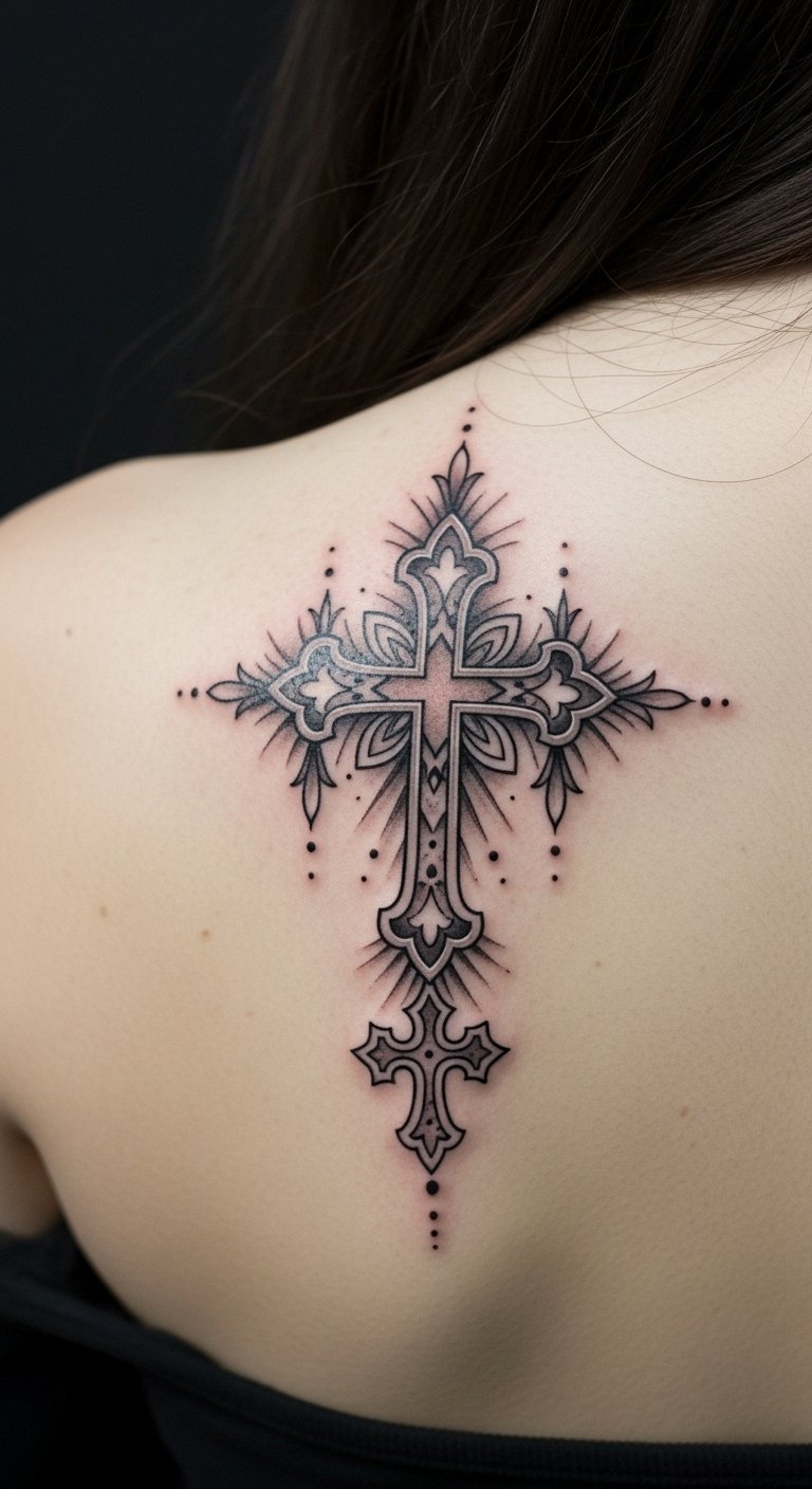 Positioned on the shoulder blade, it symbolizes the connection between the divine and the individual, inviting personal reflection and spiritual intimacy.