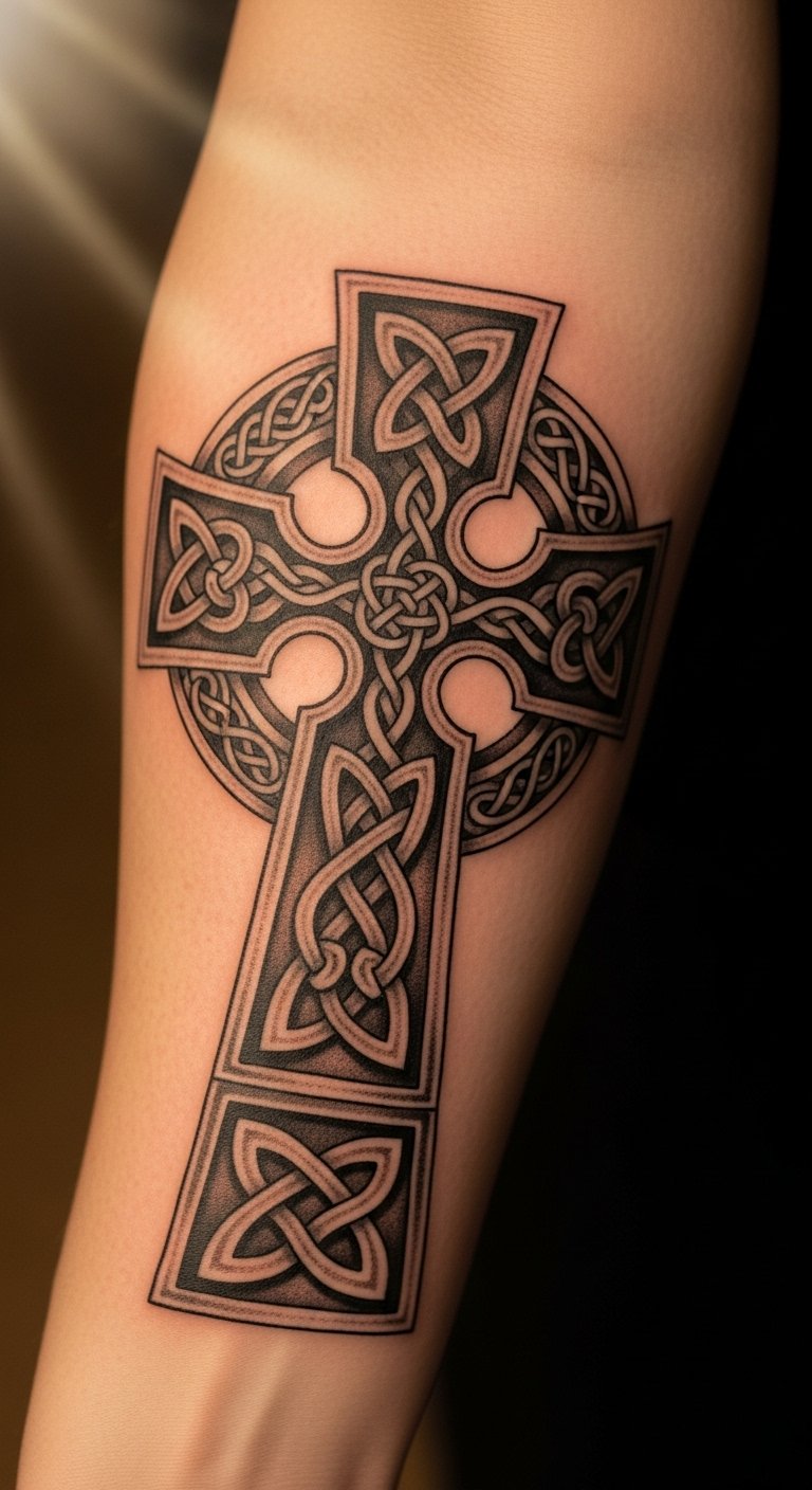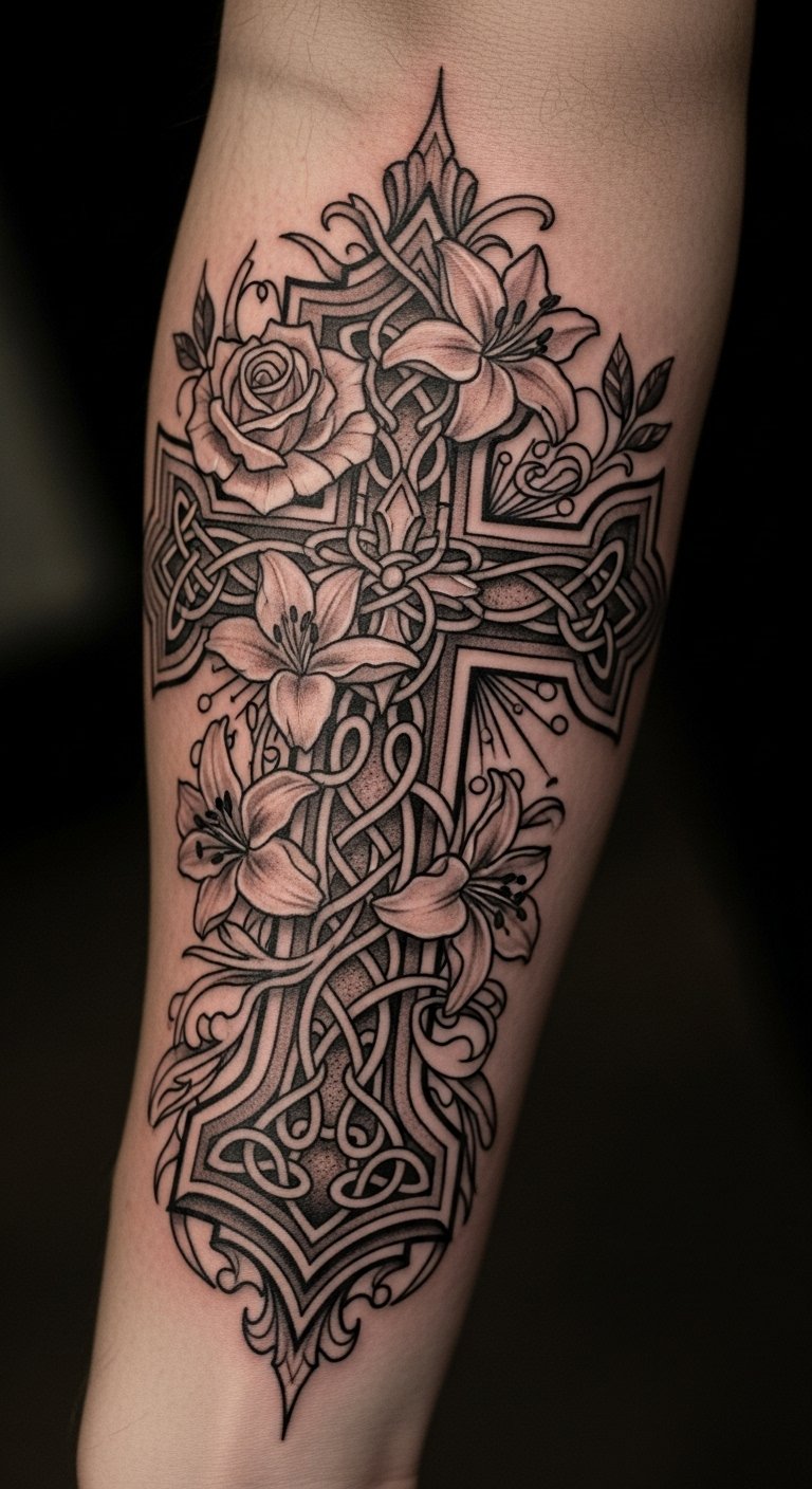 The intricate designs embody the rich history of the cross, while the natural skin tone enhances the artwork, making it a meaningful expression of identity and belief.