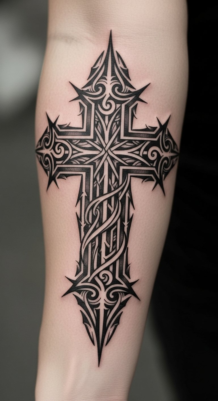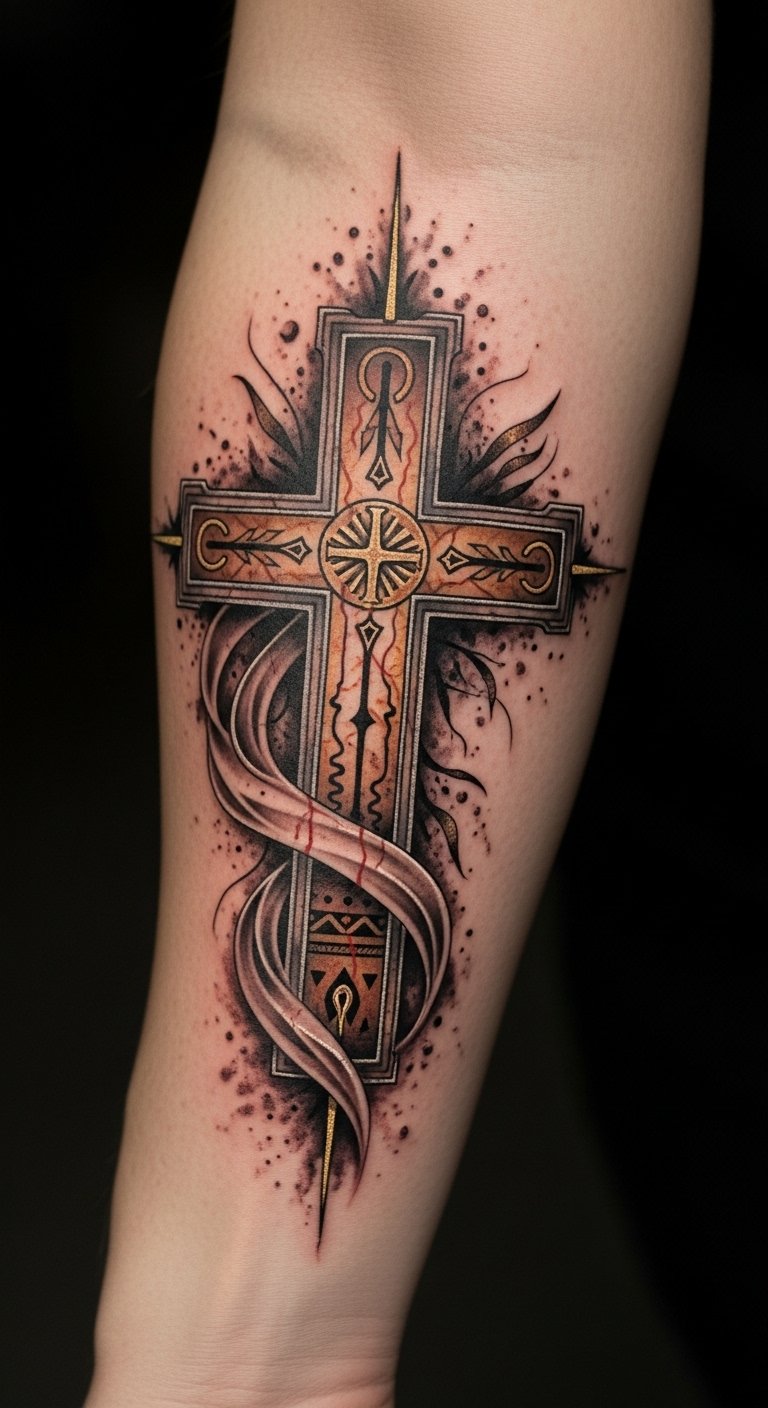 The cross tattoo on the forearm serves as a powerful emblem of sacrifice and resilience, reminding the wearer of their core values during challenging moments.