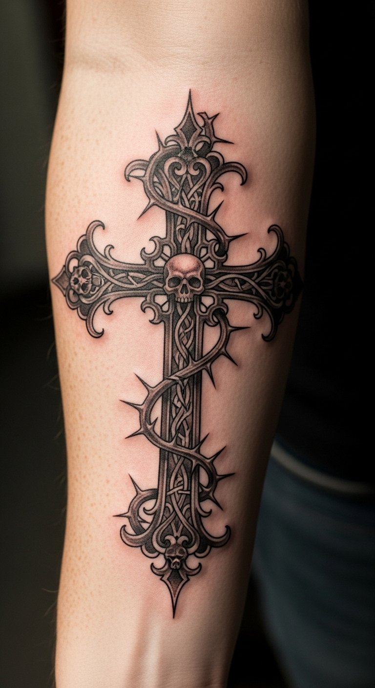This gothic cross tattoo, situated on the forearm, embodies a rich tapestry of symbolism, merging the sacred and the macabre. The thorns represent suffering and sacrifice, while the skull motifs evoke a fascination with mortality.