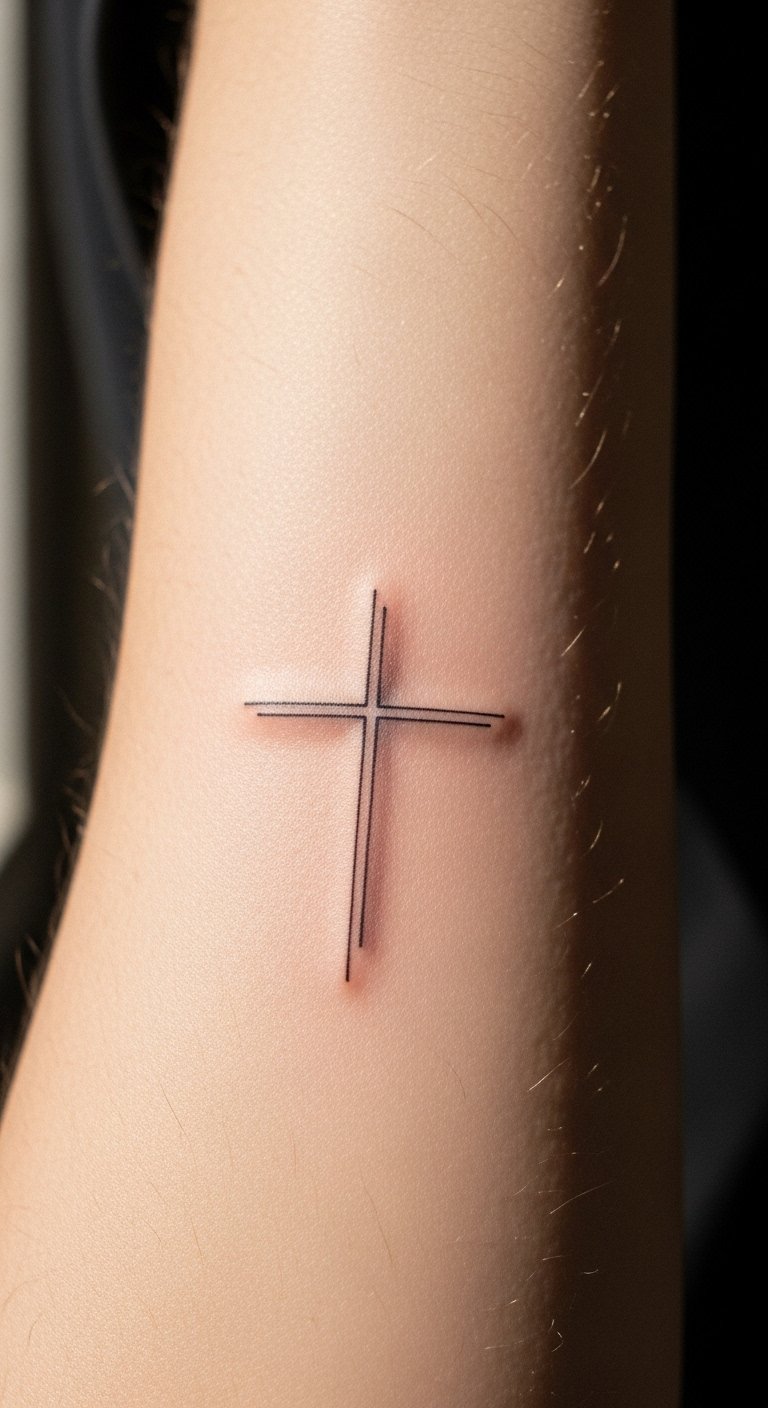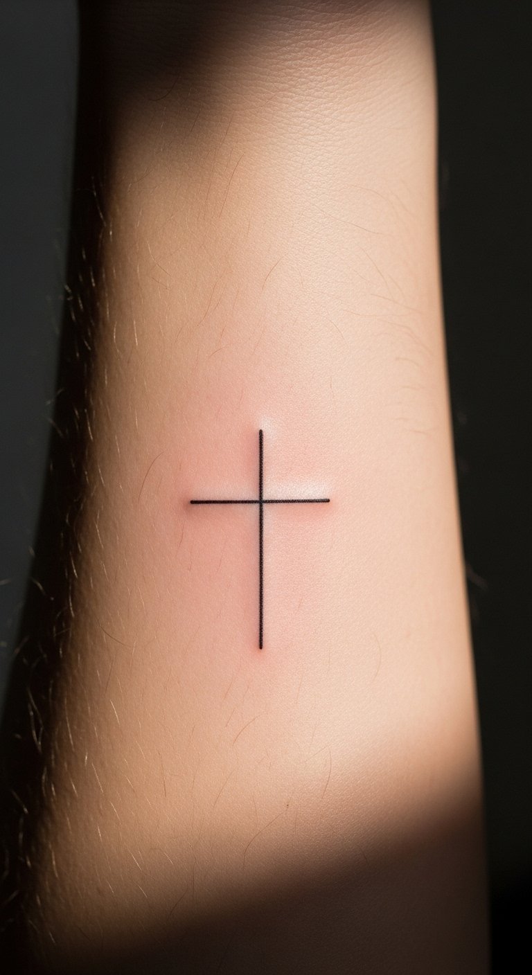 The minimalist cross tattoo on the inner forearm symbolizes the wearer’s faith and personal journey, serving as a daily reminder of their beliefs.